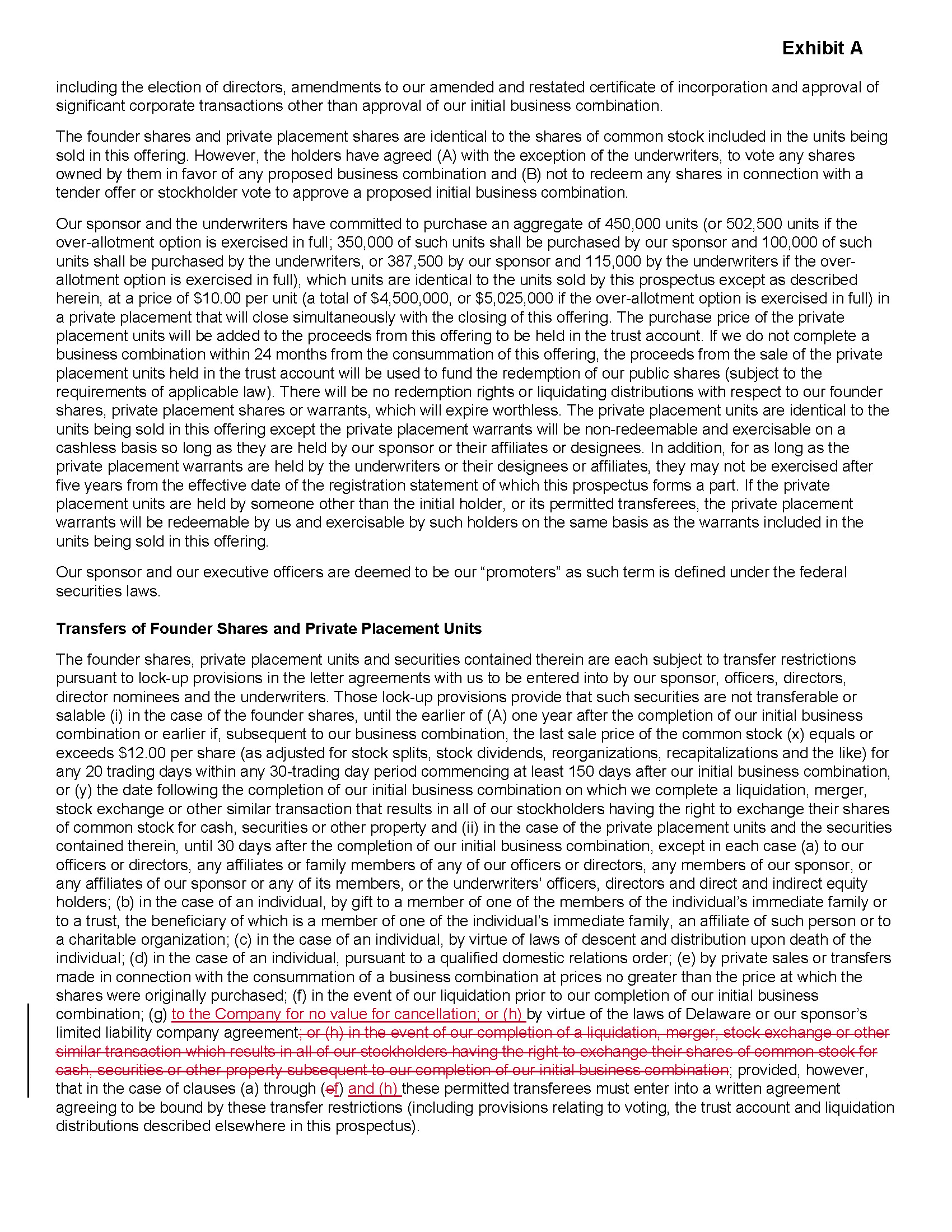 | 1. | Please tell us which section of which exhibit requires transferees to be bound by the provisions that you mention in your revisions made in response to prior comment 8. Also, from those revisions, it appears that your securities could be transferred in accordance with your sponsor's LLC agreement or in connection with a liquidation, and the agreements regarding voting, the trust account, and liquidation distributions would not apply to the transferees. If so, please clearly explain in your risk factors and highlight the risk in your prospectus summary. |