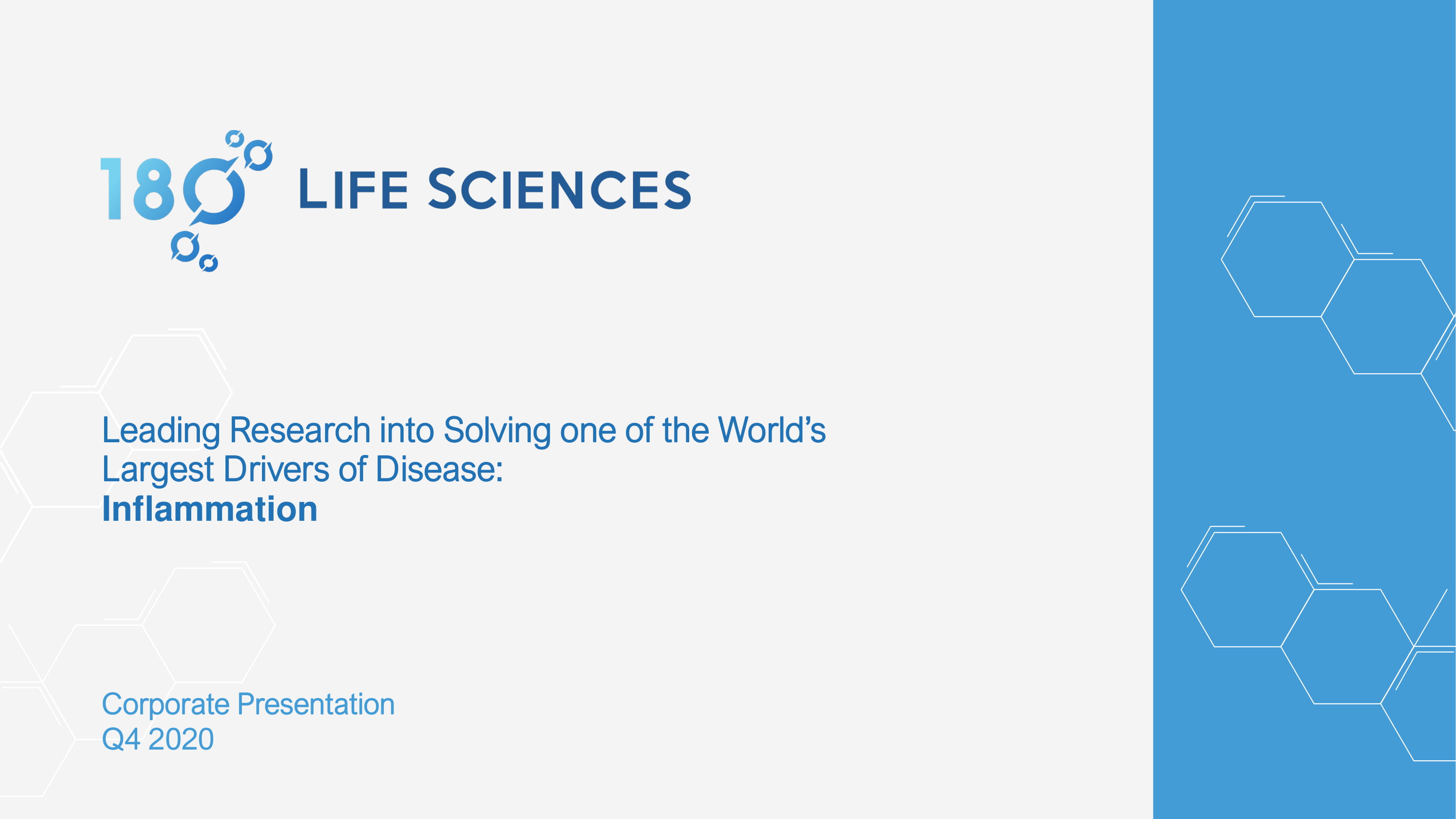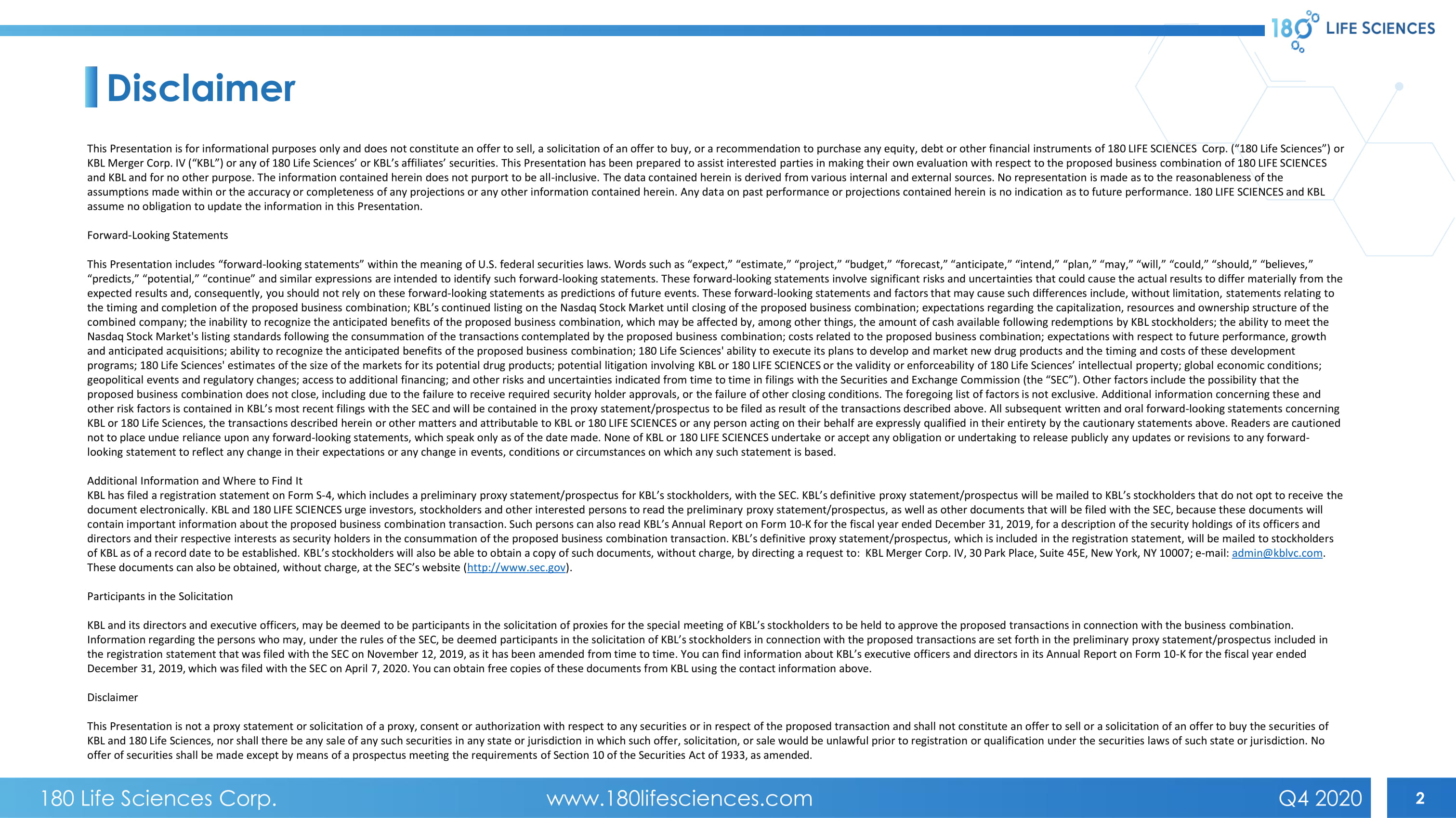180 Life Sciences Corp. www.180lifesciences.com Q4 2020 2 This Presentation is for informational purposes only and does not constitute an offer to sell, a solicitation of an offer to buy , or a recommendation to purchase any equity, debt or other financial instruments of 180 LIFE SCIENCES Corp. (“180 Life Scie nce s”) or KBL Merger Corp. IV (“KBL”) or any of 180 Life Sciences’ or KBL’s affiliates’ securities. This Presentation has been prepared to assist interested parties in making their own evaluation with respect to the proposed business combination of 180 LIFE SCIENC ES and KBL and for no other purpose. The information contained herein does not purport to be all - inclusive. The data contained here in is derived from various internal and external sources. No representation is made as to the reasonableness of the assumptions made within or the accuracy or completeness of any projections or any other information contained herein. Any dat a o n past performance or projections contained herein is no indication as to future performance. 180 LIFE SCIENCES and KBL assume no obligation to update the information in this Presentation. Forward - Looking Statements This Presentation includes “forward - looking statements” within the meaning of U.S. federal securities laws. Words such as “expec t,” “estimate,” “project,” “budget,” “forecast,” “anticipate,” “intend,” “plan,” “may,” “will,” “could,” “should,” “believes, ” “predicts,” “potential,” “continue” and similar expressions are intended to identify such forward - looking statements. These forw ard - looking statements involve significant risks and uncertainties that could cause the actual results to differ materially from the expected results and, consequently, you should not rely on these forward - looking statements as predictions of future events. The se forward - looking statements and factors that may cause such differences include, without limitation, statements relating to the timing and completion of the proposed business combination; KBL’s continued listing on the Nasdaq Stock Market until clos ing of the proposed business combination; expectations regarding the capitalization, resources and ownership structure of the combined company; the inability to recognize the anticipated benefits of the proposed business combination, which may be affecte d by, among other things, the amount of cash available following redemptions by KBL stockholders; the ability to meet the Nasdaq Stock Market's listing standards following the consummation of the transactions contemplated by the proposed business com bination; costs related to the proposed business combination; expectations with respect to future performance, growth and anticipated acquisitions; ability to recognize the anticipated benefits of the proposed business combination; 180 Life Sc ien ces' ability to execute its plans to develop and market new drug products and the timing and costs of these development programs; 180 Life Sciences' estimates of the size of the markets for its potential drug products; potential litigation invol vin g KBL or 180 LIFE SCIENCES or the validity or enforceability of 180 Life Sciences’ intellectual property; global economic con dit ions; geopolitical events and regulatory changes; access to additional financing; and other risks and uncertainties indicated from tim e to time in filings with the Securities and Exchange Commission (the “SEC”). Other factors include the possibility that the proposed business combination does not close, including due to the failure to receive required security holder approvals, or the failure of other closing conditions. The foregoing list of factors is not exclusive. Additional information concerning these an d other risk factors is contained in KBL’s most recent filings with the SEC and will be contained in the proxy statement/prospe ctu s to be filed as result of the transactions described above. All subsequent written and oral forward - looking statements concerni ng KBL or 180 Life Sciences, the transactions described herein or other matters and attributable to KBL or 180 LIFE SCIENCES or any person acting on their behalf are expressly qualified in their entirety by the cautionary statements above. Readers are cauti on ed not to place undue reliance upon any forward - looking statements, which speak only as of the date made. None of KBL or 180 LIFE S CIENCES undertake or accept any obligation or undertaking to release publicly any updates or revisions to any forward - looking statement to reflect any change in their expectations or any change in events, conditions or circumstances on which a ny such statement is based. Additional Information and Where to Find It KBL has filed a registration statement on Form S - 4, which includes a preliminary proxy statement/prospectus for KBL’s stockholde rs, with the SEC. KBL’s definitive proxy statement/prospectus will be mailed to KBL’s stockholders that do not opt to receive th e document electronically. KBL and 180 LIFE SCIENCES urge investors, stockholders and other interested persons to read the prel imi nary proxy statement/prospectus, as well as other documents that will be filed with the SEC, because these documents will contain important information about the proposed business combination transaction. Such persons can also read KBL’s Annual Re por t on Form 10 - K for the fiscal year ended December 31, 2019, for a description of the security holdings of its officers and directors and their respective interests as security holders in the consummation of the proposed business combination transac tio n. KBL’s definitive proxy statement/prospectus, which is included in the registration statement, will be mailed to stockholde rs of KBL as of a record date to be established. KBL’s stockholders will also be able to obtain a copy of such documents, withou t c harge, by directing a req