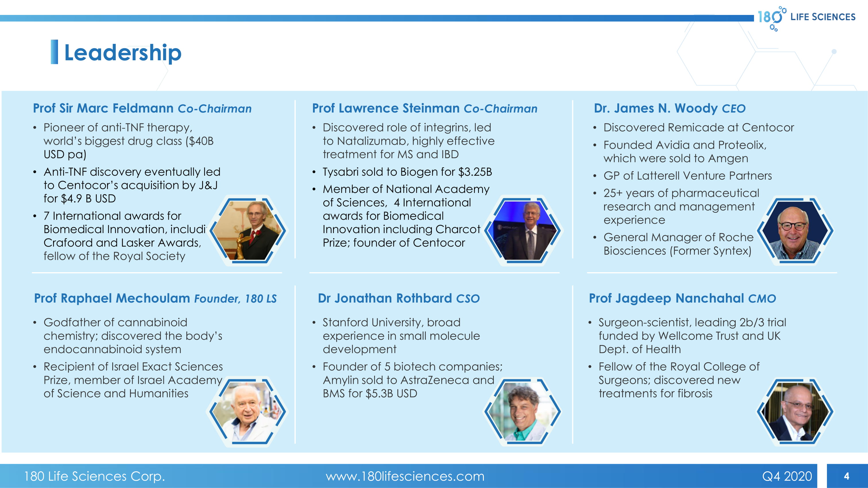 3 • Scientific team and founders are pioneers with proven track record in drug discovery from the University of Oxford, Hebrew University and Stanford University • Developing three families of novel drugs addressing significant market opportunities in inflammation, fibrosis and pain: ─ Fibrosis & Anti - TNF ─ Synthetic CBD Analogs (SCAs) ─ a7nAChR • Multiple programs in synchronized stages of development • Numerous near - term inflection points for anti - TNF programs: one program late stage 2b/3 trial, two additional clinical programs projected to start Q3/4 2021 ─ Initial clinical anti - TNF clinical trials funded by investments and grants (UK). ─ Regulatory approvals obtained from the UK Medicines and Healthcare Products Regulatory Agency (MHRA) and the Dutch Centrale Commissie Mensgebonden Onderzoek (CCMO) and the relevant accredited ethics committees to perform clinical trials in the UK and The Netherlands for anti - TNF products(1) • Strong IP portfolio with a long lifespan, providing coverage up to 2039 (1) No meetings have been held with, and no applications or requests for approval have been submitted to the FDA for any prod uct s at this time. 180 Life Sciences Highlights 180 Life Sciences Corp. www.180lifesciences.com Q4 2020