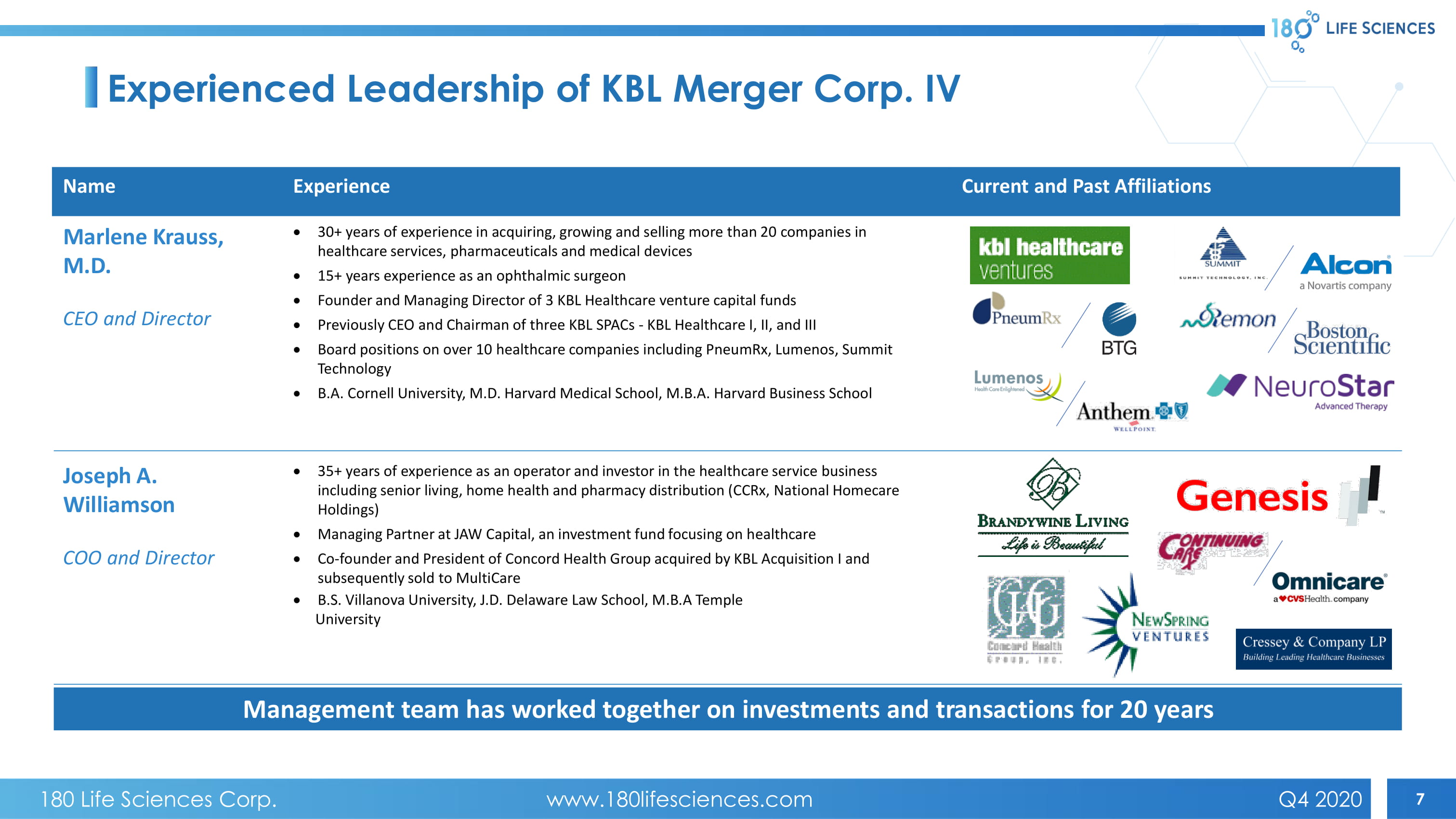6 Proposed Business Combination Overview • KBL Merger Corp. IV (“ KBLM ”) has entered into a definitive business combination agreement with 180 Life Sciences Corp. (“ 180 Life Sciences ”) • The transaction is expected to close in early Q4 2020 • It is anticipated that the post - closing company will retain the 180 Life Sciences name and be listed on NASDAQ under the ticker ATNF Transaction Structure • At the time of the business combination, 180 Life Sciences will have 17,500,000 shares issued and outstanding • Each share of 180 Life Sciences will be exchanged for one share of KBLM, valued at $175 million Valuation Illustrative Valuation (in millions, except per share data) Illustrative Proforma Ownership (1) Assumes all convertible debt is converted (2) Based on latest redemption price reported on KBLM 10Q for 06/30/2020 (3) Preferred equity issuable at the closing of the business combination Proforma Shares Outstanding (1) 25.16 Current Redemption Price (2) $10.93 Equity Value $274.95 Debt $1.87 Preferred Equity (3) $3.00 180 Life Sciences Corp. www.180lifesciences.com Q4 2020