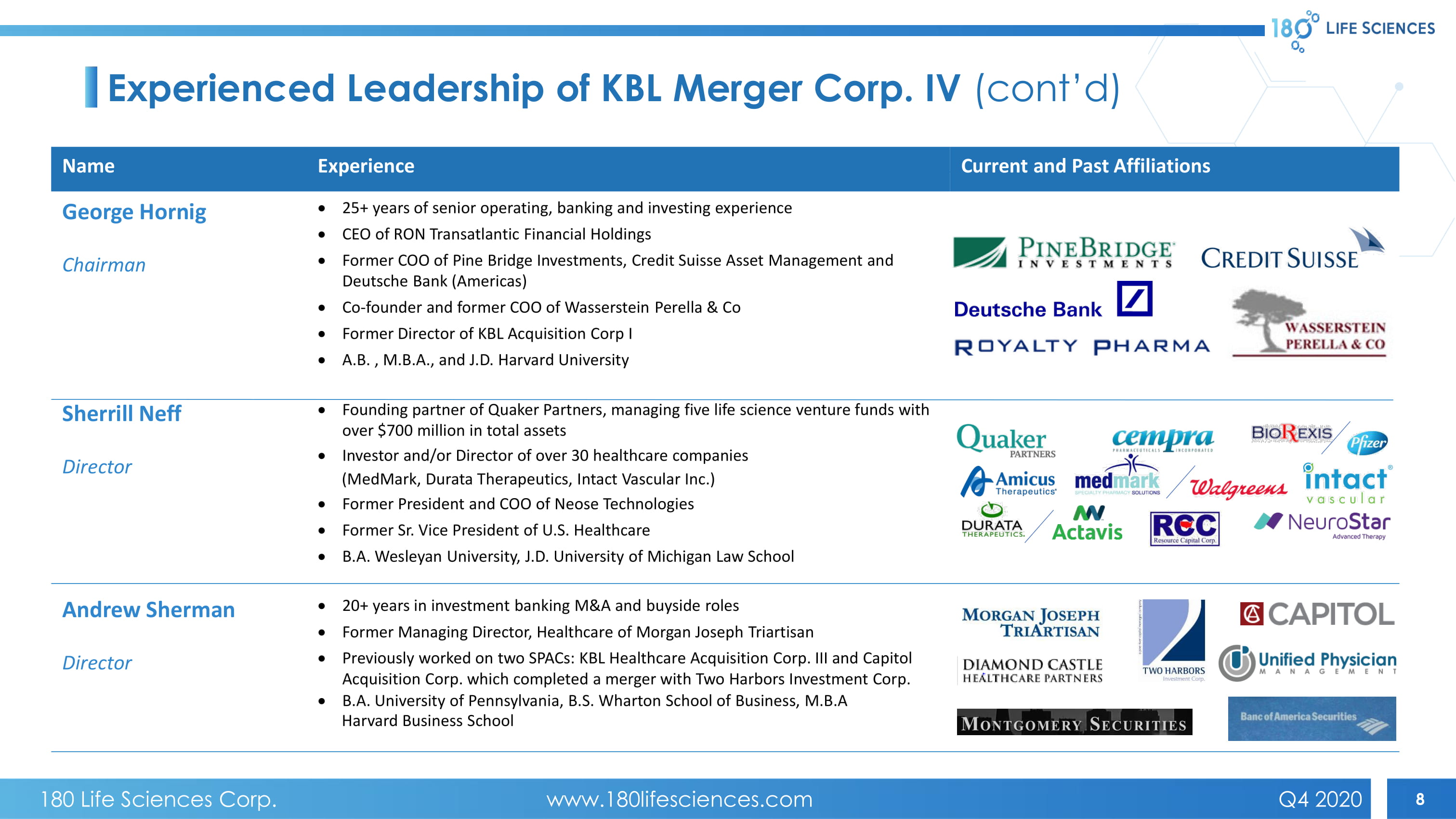 7 Management team has worked together on investments and transactions for 20 years Name Experience Current and Past Affiliations Marlene Krauss, M.D. CEO and Director 30+ years of experience in acquiring, growing and selling more than 20 companies in healthcare services, pharmaceuticals and medical devices 15+ years experience as an ophthalmic surgeon Founder and Managing Director of 3 KBL Healthcare venture capital funds Previously CEO and Chairman of three KBL SPACs - KBL Healthcare I, II, and III Board positions on over 10 healthcare companies including PneumRx , Lumenos , Summit Technology B.A. Cornell University, M.D. Harvard Medical School, M.B.A. Harvard Business School Joseph A. Williamson COO and Director 35+ years of experience as an operator and investor in the healthcare service business including senior living, home health and pharmacy distribution ( CCRx , National Homecare Holdings) Managing Partner at JAW Capital, an investment fund focusing on healthcare Co - founder and President of Concord Health Group acquired by KBL Acquisition I and subsequently sold to MultiCare B.S. Villanova University, J.D. Delaware Law School, M.B.A Temple University Experienced Leadership of KBL Merger Corp. IV 180 Life Sciences Corp. www.180lifesciences.com Q4 2020
