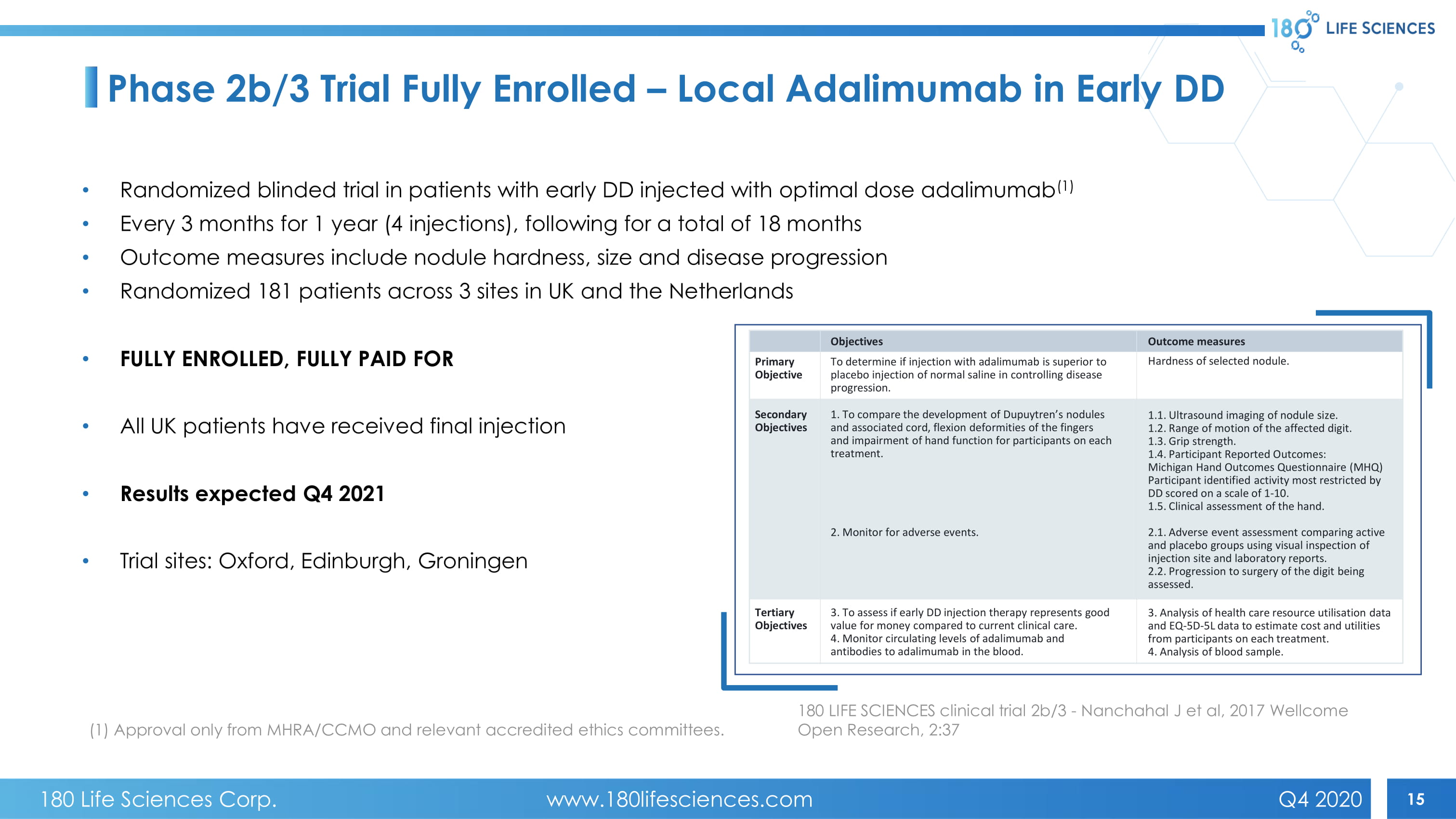 14 Phase 2a Completed: 40 mg (in 0.4ml) Adalimumab is Effective • Dose ranging with 28 patients. • 40 mg in 0.4ml - effective dose. • Funded by HICF ( Wellcome Trust + Dept of Health) and 180 Life Sciences Trial Overview Adalimumab injected directly into the nodule Demonstrated efficacy at high concentration & dose 15mg in 0.3ml (1.60 0.67) 40mg in 0.4ml Placebo (1.51 0.65) 35mg in 0.7ml* (1.44 0.48) (1.09 0.89) *Leakage observed from site injection due to large volume 5.0 4.0 3.0 2.0 1.0 0.0 Placebo 15mg 35mg 40mg a dalimumab Treatment p=0.024 p=0.006 p<0.001 1250 1000 750 500 250 0.0 Placebo 15mg 35mg 40mg a dalimumab p=0.019 The First Trial Of Any Targeted Therapy In Early DD (1) : Anti - Tumour Necrosis Factor Therapy for Dupuytren’s Disease: A Randomized Dose Response Proof of Concept Phase 2A Clinical Trial (2) (1) Approval only from MHRA/CCMO and relevant accredited ethics committees. (2) EBioMedicine 33 (2018) 282 - 288 180 Life Sciences Corp. www.180lifesciences.com Q4 2020