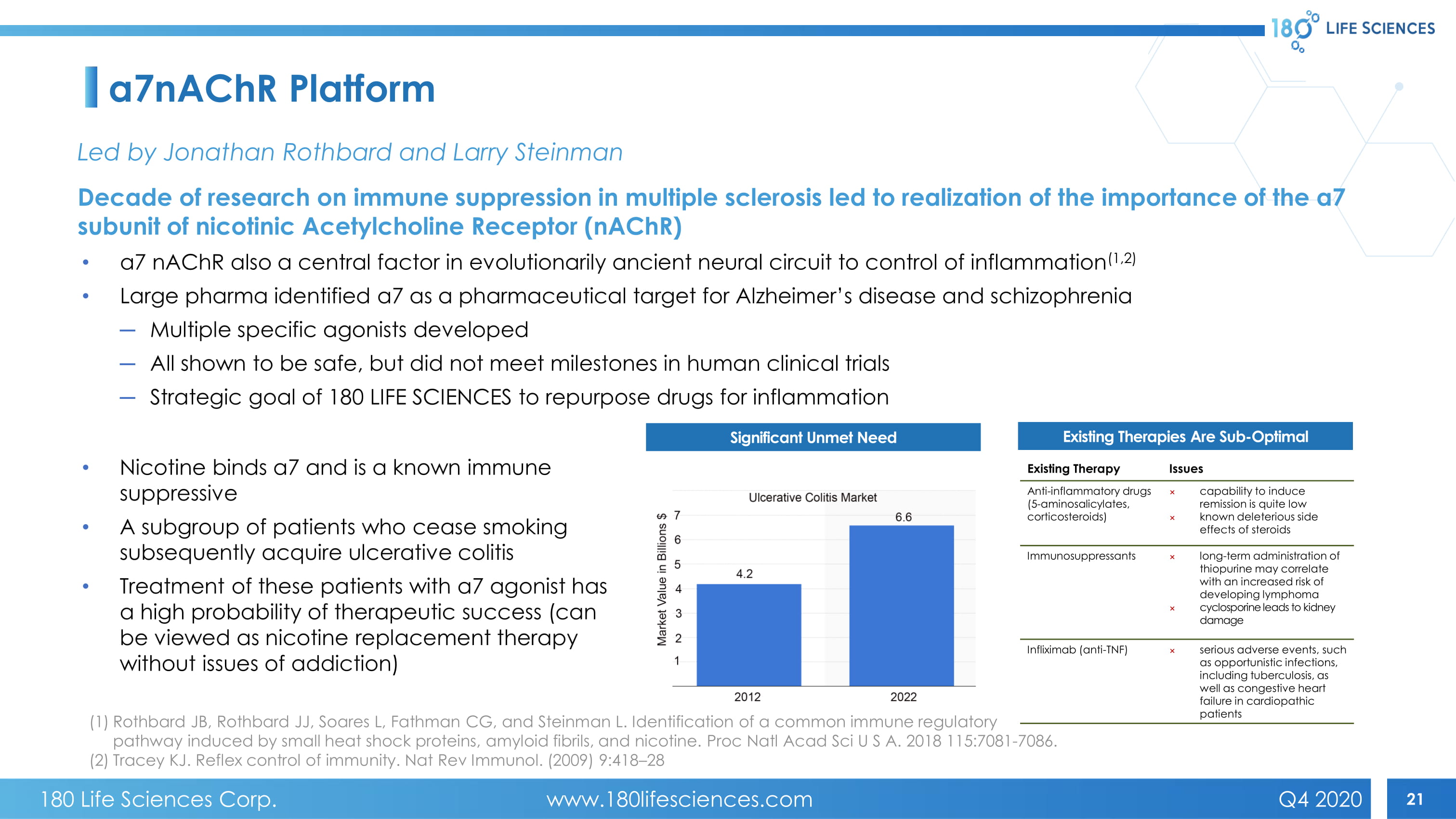 21 a7nAChR Platform Led by Jonathan Rothbard and Larry Steinman Decade of research on immune suppression in multiple sclerosis led to realization of the importance of the a7 subunit of nicotinic Acetylcholine Receptor ( nAChR ) • a 7 nAChR also a central factor in evolutionarily ancient neural circuit to control of inflammation ( 1,2 ) • Large pharma identified a 7 as a pharmaceutical target for Alzheimer’s disease and schizophrenia ─ Multiple specific agonists developed ─ All shown to be safe, but did not meet milestones in human clinical trials ─ Strategic goal of 180 LIFE SCIENCES to repurpose drugs for inflammation (1) Rothbard JB, Rothbard JJ, Soares L, Fathman CG, and Steinman L. Identification of a common immune regulatory pathway induced by small heat shock proteins, amyloid fibrils, and nicotine. Proc Natl Acad Sci U S A. 2018 115:7081 - 7086. (2) Tracey KJ. Reflex control of immunity. Nat Rev Immunol. (2009) 9:418 – 28 Significant Unmet Need Existing Therapies Are Sub - Optimal Existing Therapy Issues Anti - inflammatory drugs (5 - aminosalicylates, corticosteroids) × capability to induce remission is quite low × known deleterious side effects of steroids Immunosuppressants × long - term administration of thiopurine may correlate with an increased risk of developing lymphoma × cyclosporine leads to kidney damage Infliximab (anti - TNF) × serious adverse events, such as opportunistic infections, including tuberculosis, as well as congestive heart failure in cardiopathic patients • Nicotine binds a7 and is a known immune suppressive • A subgroup of patients who cease smoking subsequently acquire ulcerative colitis • Treatment of these patients with a7 agonist has a high probability of therapeutic success (can be viewed as nicotine replacement therapy without issues of addiction) 180 Life Sciences Corp. www.180lifesciences.com Q4 2020