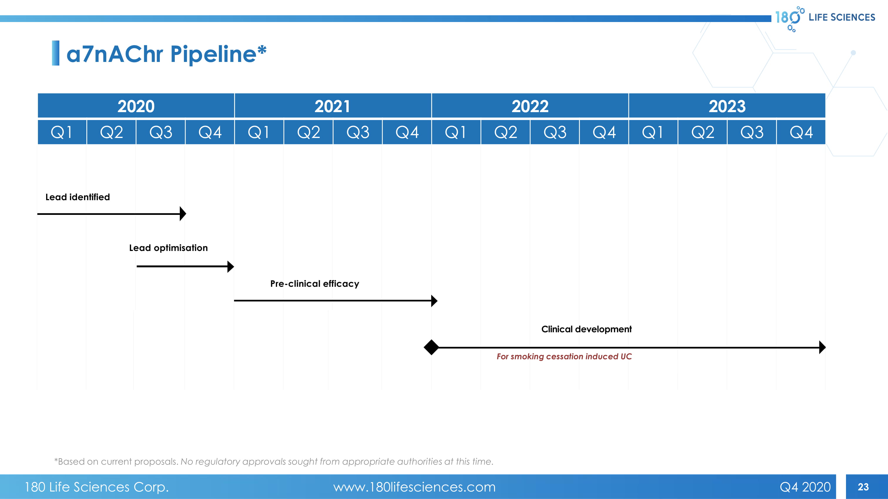 23 Pre - clinical efficacy Lead identified Lead optimisation Clinical development For smoking cessation induced UC a7nAChr Pipeline* 2020 2021 2022 2023 Q1 Q2 Q3 Q4 Q1 Q2 Q3 Q4 Q1 Q2 Q3 Q4 Q1 Q2 Q3 Q4 *Based on current proposals. No regulatory approvals sought from appropriate authorities at this time. 180 Life Sciences Corp. www.180lifesciences.com Q4 2020