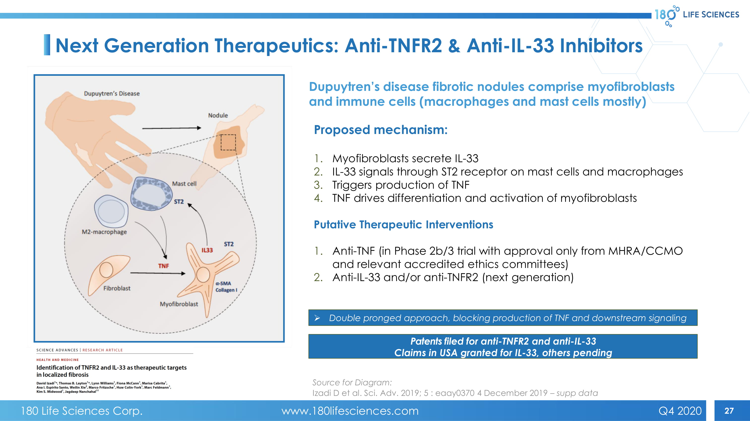 27 Next Generation Therapeutics: Anti - TNFR2 & Anti - IL - 33 Inhibitors Proposed mechanism: 1. Myofibroblasts secrete IL - 33 2. IL - 33 signals through ST2 receptor on mast cells and macrophages 3. Triggers production of TNF 4. TNF drives differentiation and activation of myofibroblasts Putative Therapeutic Interventions 1. Anti - TNF (in Phase 2b/3 trial with approval only from MHRA/CCMO and relevant accredited ethics committees) 2. Anti - IL - 33 and/or anti - TNFR2 (next generation) » Double pronged approach, blocking production of TNF and downstream signaling Patents filed for anti - TNFR2 and anti - IL - 33 Claims in USA granted for IL - 33, others pending Dupuytren’s disease fibrotic nodules comprise myofibroblasts and immune cells (macrophages and mast cells mostly) Source for Diagram: Izadi D et al. Sci. Adv. 2019; 5 : eaay0370 4 December 2019 – supp data 180 Life Sciences Corp. www.180lifesciences.com Q4 2020