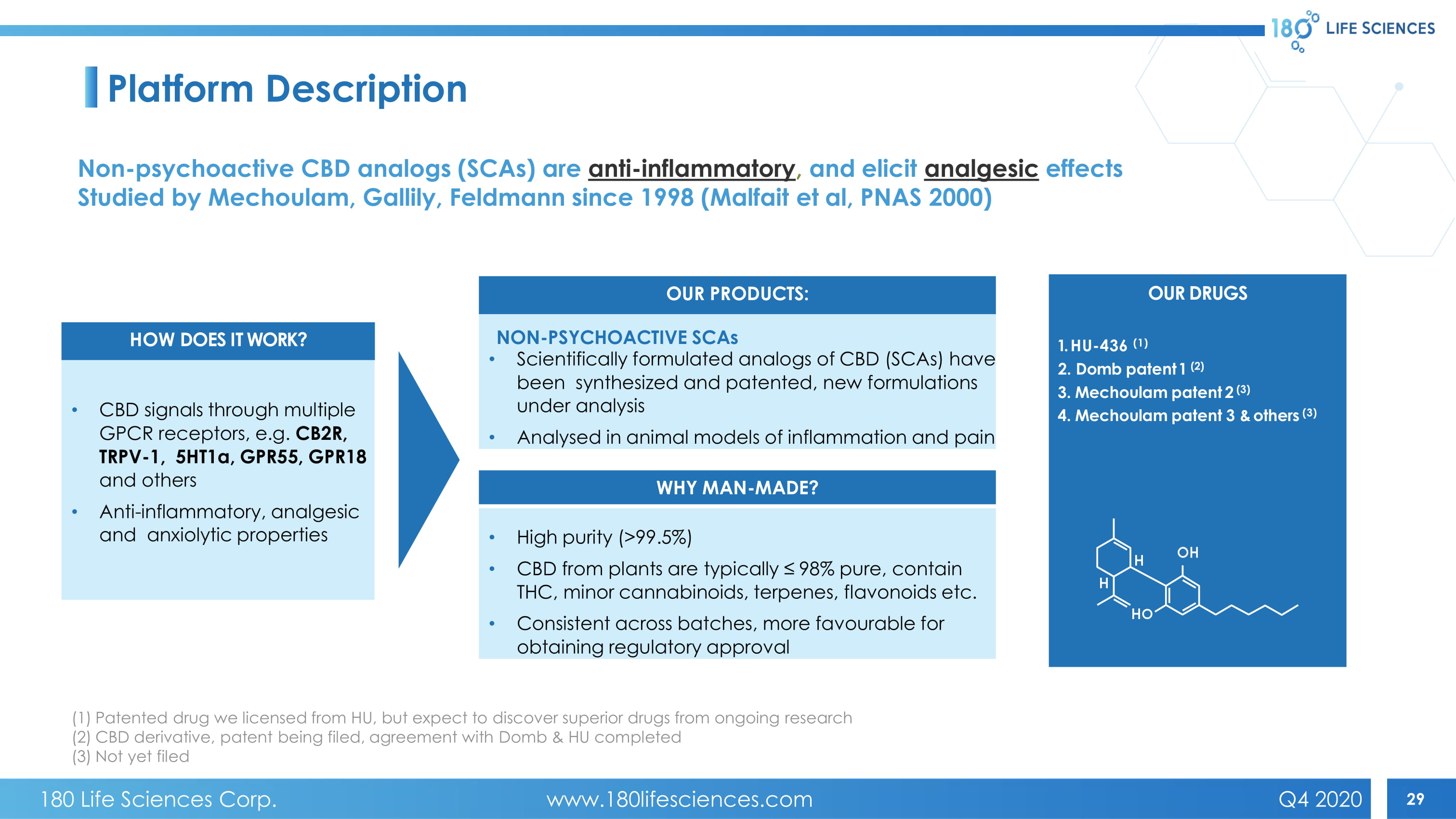 29 Platform Description OUR DRUGS 1. HU - 436 (1) 2. Domb patent 1 (2) 3. Mechoulam patent 2 (3) 4. Mechoulam patent 3 & others (3) HOW DOES IT WORK? OUR PRODUCTS: WHY MAN - MADE? • CBD signals through multiple GPCR receptors, e.g. CB2R, TRPV - 1, 5HT1α, GPR55, GPR18 and others • Anti - inflammatory, analgesic and anxiolytic properties NON - PSYCHOACTIVE SCAs • Scientifically formulated analogs of CBD (SCAs) have been synthesized and patented , new formulations under analysis • Analysed in animal models of inflammation and pain • High purity (>99.5%) • CBD from plants are typically ≤ 98% pure, contain THC, minor cannabinoids, terpenes, flavonoids etc. • Consistent across batches , more favourable for obtaining regulatory approval Non - psychoactive CBD analogs (SCAs) are anti - inflammatory , and elicit analgesic effects Studied by Mechoulam , Gallily , Feldmann since 1998 (Malfait et al, PNAS 2000) (1) Patented drug we licensed from HU, but expect to discover superior drugs from ongoing research (2) CBD derivative, patent being filed, agreement with Domb & HU completed (3) Not yet filed 180 Life Sciences Corp. www.180lifesciences.com Q4 2020