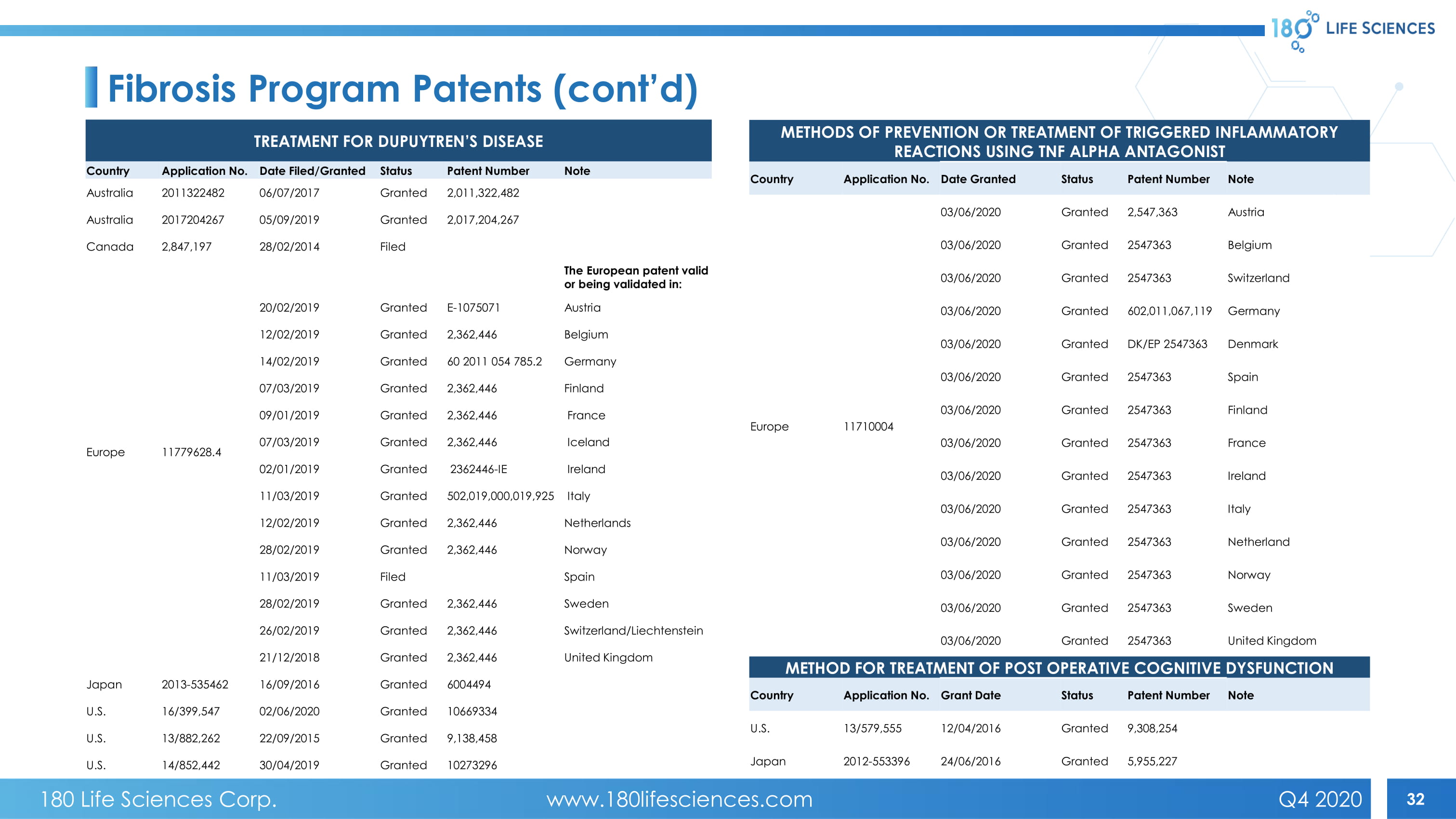 31 Fibrosis Program Patents METHOD OF TREATING EARLY STAGE DUPUYTREN'S DISEASE Country Application No. Date Filed Status Australia 2017248273 16/10/2018 Filed Canada 3020327 05/10/2018 Filed Europe 17779836 05/11/2018 Filed Hong Kong 19128046 12/08/2019 Filed U.S. 62/320,151 08/04/2016 Filed U.S. 16/089,234 27/09/2018 Filed METHOD OF TREATING A LOCALIZED FIBROTIC DISORDER USING AN IL - 33 ANTAGONIST Country Application No. Date Filed Status Australia 2016226414 15/09/2017 Filed Canada 2,978,449 29/02/2016 Filed Europe 16759325 25/09/2017 Filed Hong Kong 18107063.7 30/05/2018 Filed U.S. 15/555,027 15/12/2017 Granted 10/12/2019 US10500273B2 METHOD OF TREATING A LOCALIZED FIBROTIC DISORDER USING A TNF RECEPTOR 2 ANTAGONIST Country Application No. Date Filed Status Australia 2016226415 18/09/2017 Filed Canada 2,978,431 29/02/2016 Filed Europe 16759326.8 25/09/2017 Filed Hong Kong 18107062.8 30/05/2018 Filed U.S. 15/555,030 31/08/2017 Filed METHOD OF TREATING OCULAR FIBROSIS USING AN IL - 33/TNF BISPECIFIC ANTIBODY Country Application No. Date Filed Status U.S. 62/722,263 24/08/2018 Filed METHOD OF TREATING LOCALIZED FIBROTIC DISORDERS USING AN IL - 33/TNF BISPECIFIC ANTIBODY Country Application No. Date Filed Status U.S. 16/328,979 27/02/2019 Filed Europe 17924768.9 01/04/2019 Filed METHOD OF TREATING SYSTEMIC FIBROTIC DISORDERS USING AN IL - 33/TNF BISPECIFIC ANTIBODY Country Application No. Date Filed Status U.S. 16/329,013 27/02/2019 Filed Europe 17847574.5 01/04/2019 Filed Hong Kong 62020001194 09/01/2020 Filed METHOD OF TREATING FIBROPROLIFERATIVE DISORDERS INCLUDING DUPUYREN'S WITH ONE OR MORE SPECIFIC HUMAN MMP AND ATNF ANTAGONIST Country Application No. Date Filed Status U.S. 61/845,366 11/07/2013 Filed USES OF IL - 33 RECEPTORS ANTAGONIST Country Application No. Date Filed Status U.S. 62/127,157 02/03/2015 Filed 180 Life Sciences Corp. www.180lifesciences.com Q4 2020