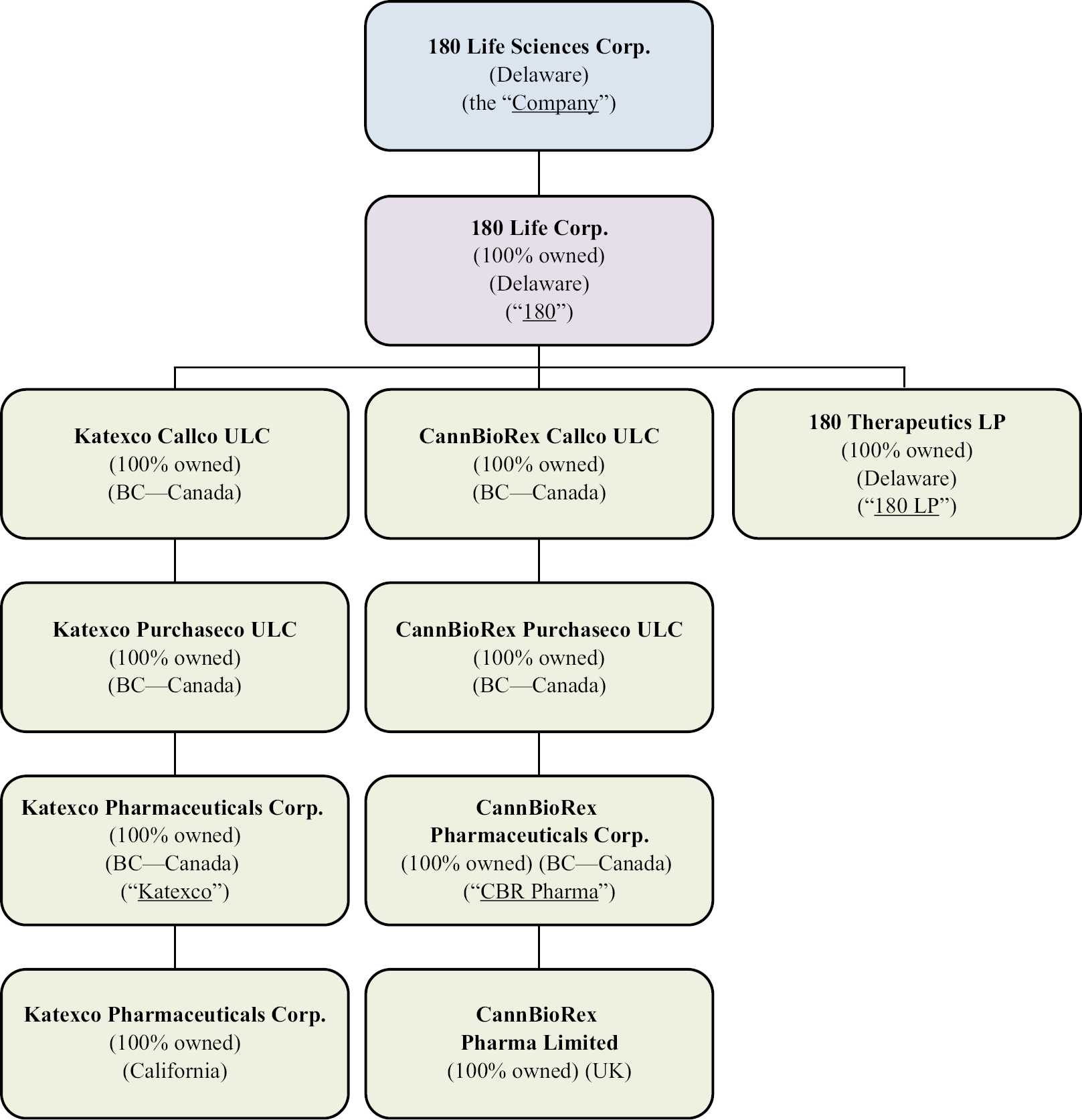 • “Exchangeable Shares” means the exchangeable shares issued concurrently with the closing of the Reorganization (as defined in the Business Combination Agreement) by (i) Katexco Purchaseco ULC, a Canadian subsidiary of 180, to certain Canadian former shareholders of Katexco; and (ii) CannBioRex Purchaseco ULC, a Canadian subsidiary of 180, to certain Canadian former shareholders of CBR Pharma, which were exchangeable for common stock of 180 prior to the Effective Time (as defined in the Business Combination Agreement) and which became exchangeable into shares of our common stock following the Effective Time.
