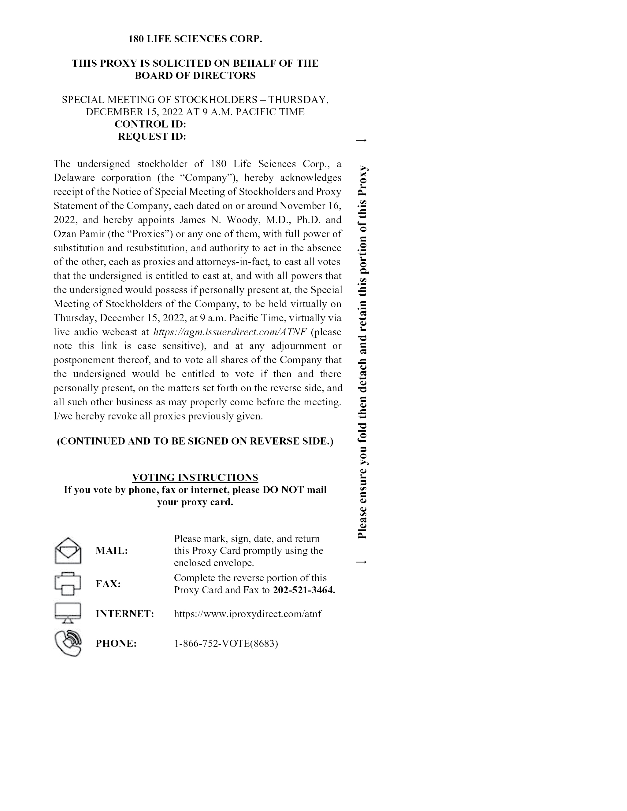 180 LIFE SCIENCES CORP. THIS PROXY IS SOLICITED ON BEHALF OF THE BOARD OF DIRECTORS Please ensure you fold then detach and retain this portion of this Proxy SPECIAL MEETING OF STOCKHOLDERS THURSDAY, DECEMBER 15, 2022 AT 9 A.M. PACIFIC TIME CONTROL ID: REQUEST ID: The undersigned stockholder of 180 Life Sciences Corp., a Delaware corporation (the “Company”), hereby acknowledges receipt of the Notice of Special Meeting of Stockholders and Proxy Statement of the Company, each dated on or around November 16, 2022, and hereby appoints James N. Woody, M.D., Ph.D. and Ozan Pamir (the “Proxies”) or any one of them, with full power of substitution and resubstitution, and authority to act in the absence of the other, each as proxies and attorneys-in-fact, to cast all votes that the undersigned is entitled to cast at, and with all powers that the undersigned would possess if personally present at, the Special Meeting of Stockholders of the Company, to be held virtually on Thursday, December 15, 2022, at 9 a.m. Pacific Time, virtually via live audio webcast at https://agm.issuerdirect.com/ATNF (please note this link is case sensitive), and at any adjournment or postponement thereof, and to vote all shares of the Company that the undersigned would be entitled to vote if then and there personally present, on the matters set forth on the reverse side, and all such other business as may properly come before the meeting. I/we hereby revoke all proxies previously given. (CONTINUED AND TO BE SIGNED ON REVERSE SIDE.) VOTING INSTRUCTIONS If you vote by phone, fax or internet, please DO NOT mail your proxy card. MAIL: Please mark, sign, date, and return this Proxy Card promptly using the enclosed envelope. FAX: Complete the reverse portion of this Proxy Card and Fax to 202-521-3464. INTERNET: https://www.iproxydirect.com/atnf PHONE: 1-866-752-VOTE(8683)