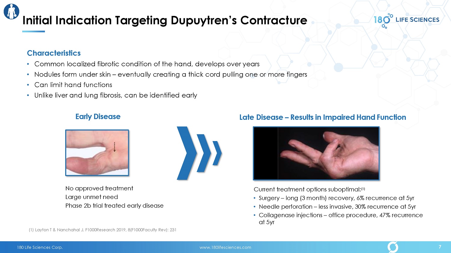 180 Life Sciences Corp. www.180lifesciences.com Characteristics • Common localized fibrotic condition of the hand , develops over years • Nodules form under skin – eventually creating a thick cord pulling one or more fingers • Can limit hand functions • Unlike liver and lung fibrosis, can be identified early Early D isease Late D isease – Results in Impaired H and Function No approved treatment Large unmet need Phase 2b trial treated early disease Current treatment options suboptimal: (1) • Sur gery – long (3 month) recovery, 6% recurrence at 5yr • N eedle perforation – less invasive, 30% recurrence at 5yr • C ollagenase injections – office procedure, 47% recurrence at 5 yr Initial Indication Targeting Dupuytren’s Contracture ( 1 ) Layton T & Nanchahal J. F1000Research 2019, 8(F1000Faculty Rev): 231 7