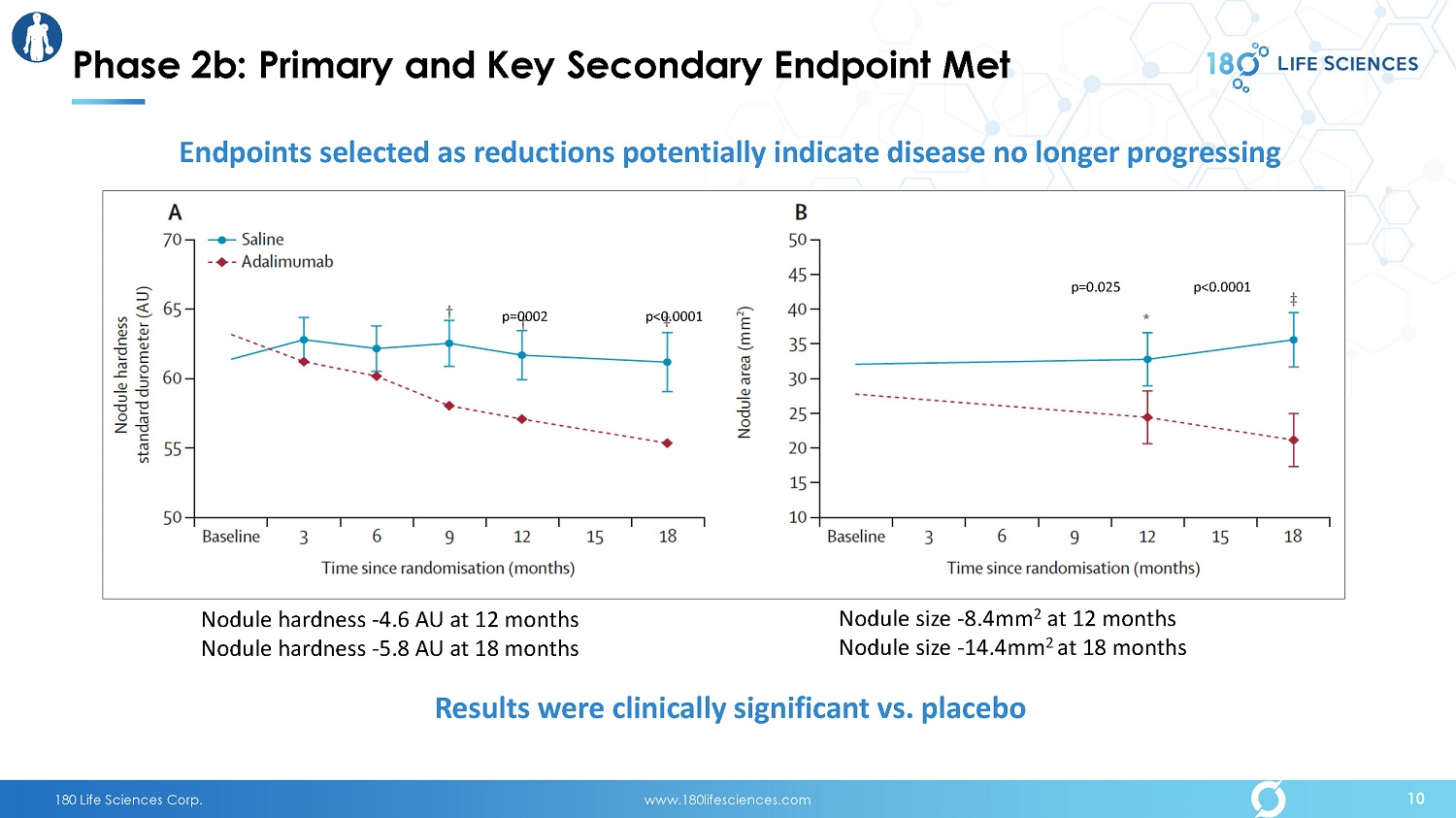 180 Life Sciences Corp. www.180lifesciences.com Phase 2a Completed: 40mg (in 0.4ml) Adalimumab is Effective • Dose ranging with 28 patients • 40 mg in 0.4ml – effective dose • Funded by HICF (Wellcome Trust + Dept of Health) and 180 Life Sciences Trial Overview Adalimumab injected directly into the nodule Demonstrated Efficacy at High C oncentration & D ose 15mg in 0.3ml (1.60 0.67) 40mg in 0.4ml Placebo (1.51 0.65) 35mg in 0.7ml* (1.44 0.48) (1.09 0.89) *Leakage observed from site injection due to large volume 5.0 4.0 3.0 2.0 1.0 0.0 Placebo 15mg 35mg 40mg a dalimumab Treatment p=0.024 p=0.006 p<0.001 1250 1000 750 500 250 0.0 Placebo 15mg 35mg 40mg a dalimumab p=0.019 The First Trial of Any Targeted Therapy in Early Dupuytren’s Contracture Anti - Tumour Necrosis Factor Therapy for Dupuytren’s Disease: A Randomized Dose Response Proof of Concept Phase 2A Clinical Trial (1) (1) EBioMedicine 33 (2018) 282 - 288 8