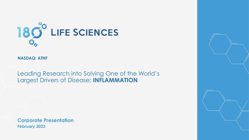 180 Life Sciences Corp. www.180lifesciences.com Corporate Presentation February 2023 Leading Research into Solving One of the World’s Largest Drivers of Disease: INFLAMMATION NASDAQ: ATNF