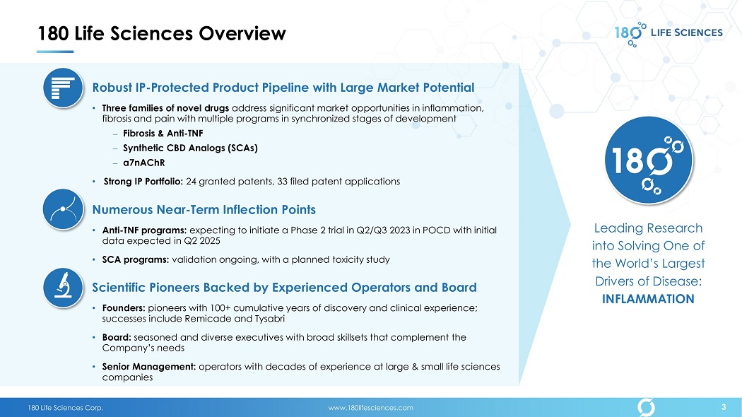 180 Life Sciences Corp. www.180lifesciences.com This Presentation is for informational purposes only and does not constitute an offer to sell, a solicitation of an offer to buy, or a recommendation to purchase any equity, debt or other financial instruments of 180 LIFE SCIENCES Corp . (“ 180 Life Sciences” or the “Company”) or any of its affiliates . This Presentation has been prepared to assist interested parties in making their own evaluation with respect to the business of 180 LIFE SCIENCES and for no other purpose . The information contained herein does not purport to be all - inclusive . The data contained herein is derived from various internal and external sources . No representation is made as to the reasonableness of the assumptions made within or the accuracy or completeness of any projections or any other information contained herein . Any data on past performance or projections contained herein is no indication as to future performance . 180 LIFE SCIENCES assumes no obligation to update the information in this Presentation . Forward - Looking Statements This Presentation includes “forward - looking statements” within the meaning of U . S . securities laws . Words such as “expect,” “estimate,” “project,” “budget,” “forecast,” “anticipate,” “intend,” “plan,” “may,” “will,” “could,” “should,” “believes,” “predicts,” “potential,” “continue” and similar expressions are intended to identify such forward - looking statements . These forward - looking statements involve significant risks and uncertainties that could cause the actual results to differ materially from the expected results and, consequently, you should not rely on these forward - looking statements as predictions of future events . These forward - looking statements and factors that may cause such differences include, without limitation, statements relating to the company’s continued listing on the Nasdaq Stock Market ; expectations regarding the future capitalization, resources and ownership structure of the company ; the inability to recognize the anticipated benefits of the business, which may be affected by, among other things, the ability of the company to execute its plans to develop and market new drug products and the timing, costs and results of these development programs ; estimates of the size of the markets for the company’s potential drug products ; potential litigation involving the company ; the validity or enforceability of the company’s intellectual property, including any challenges thereto ; global economic conditions ; geopolitical events and regulatory changes ; access to additional financing ; the duration and ongoing impact of the COVID - 19 pandemic ; and other risks and uncertainties indicated from time to time in the company’s filings with the Securities and Exchange Commission (the “SEC”) . The foregoing list of factors is not exclusive . Additional information concerning these and other risk factors is contained in the company’s most recent filings with the SEC . All subsequent written and oral forward - looking statements concerning the company and attributable to the company or any person acting on its behalf are expressly qualified in their entirety by the cautionary statements above . Readers are cautioned not to place undue reliance upon any forward - looking statements, which speak only as of the date made . The company does not undertake any obligation or undertaking to release publicly any updates or revisions to any forward - looking statement to reflect any change in its expectations or any change in events, conditions or circumstances on which any such statement is based . Disclaimer 2