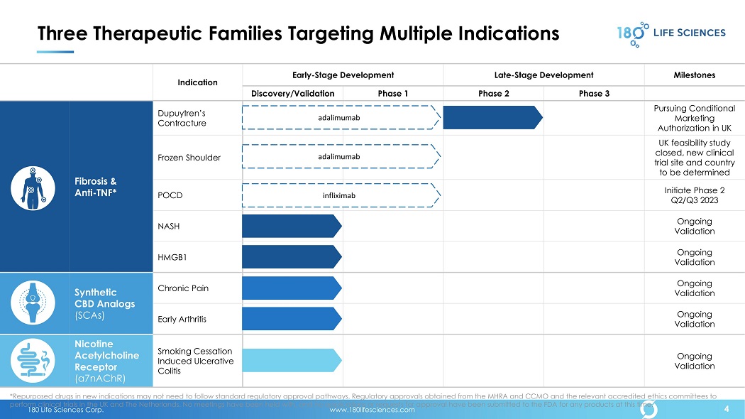 180 Life Sciences Corp. www.180lifesciences.com 180 Life Sciences Overview Leading Research into Solving One of the World’s Largest Drivers of Disease: INFLAMMATION 3 Robust IP - Protected Product Pipeline with Large Market Potential • Three families of novel drugs address significant market opportunities in inflammation, fibrosis and pain with multiple programs in synchronized stages of development ⎼ Fibrosis & Anti - TNF ⎼ Synthetic CBD Analogs (SCAs) ⎼ a7nAChR • Strong IP Portfolio: 24 granted patents, 33 filed patent applications Scientific Pioneers Backed by Experienced Operators and Board • Founders: pioneers with 100+ cumulative years of discovery and clinical experience; successes include Remicade and Tysabri • Board: seasoned and diverse executives with broad skillsets that complement the Company’s needs • Senior Management: operators with decades of experience at large & small life sciences companies Numerous Near - Term Inflection Points • Anti - TNF programs: expecting to initiate a Phase 2 trial in Q2/Q3 2023 in POCD with initial data expected in Q2 2025 • SCA programs: validation ongoing, with a planned toxicity study