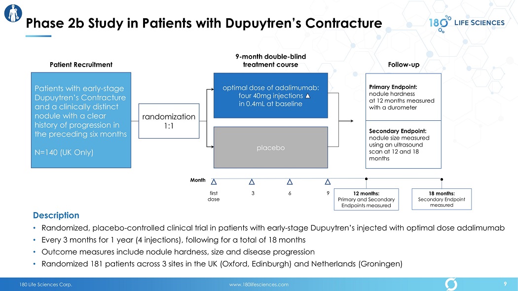 180 Life Sciences Corp. www.180lifesciences.com Phase 2a Completed: 40mg (in 0.4ml) Adalimumab is Effective • Dose ranging with 28 patients • 40 mg in 0.4ml – effective dose • Funded by HICF (Wellcome Trust + Dept of Health) and 180 Life Sciences Trial Overview Adalimumab injected directly into the nodule Demonstrated Efficacy at High C oncentration & D ose 15mg in 0.3ml (1.60 0.67) 40mg in 0.4ml Placebo (1.51 0.65) 35mg in 0.7ml* (1.44 0.48) (1.09 0.89) *Leakage observed from site injection due to large volume 5.0 4.0 3.0 2.0 1.0 0.0 Placebo 15mg 35mg 40mg a dalimumab Treatment p=0.024 p=0.006 p<0.001 1250 1000 750 500 250 0.0 Placebo 15mg 35mg 40mg a dalimumab p=0.019 The First Trial of Any Targeted Therapy in Early Dupuytren’s Contracture Anti - Tumour Necrosis Factor Therapy for Dupuytren’s Disease: A Randomized Dose Response Proof of Concept Phase 2A Clinical Trial (1) (1) EBioMedicine 33 (2018) 282 - 288 8