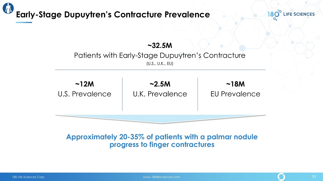 180 Life Sciences Corp. www.180lifesciences.com p=0002 p<0.0001 p<0.0001 p=0.025 Results were clinically significant vs. placebo Phase 2b: Primary and Key Secondary Endpoint Met Endpoints selected as reductions potentially indicate disease no longer progressing Nodule hardness - 4.6 AU at 12 months Nodule hardness - 5.8 AU at 18 months Nodule size - 8.4mm 2 at 12 months Nodule size - 14.4mm 2 at 18 months 10