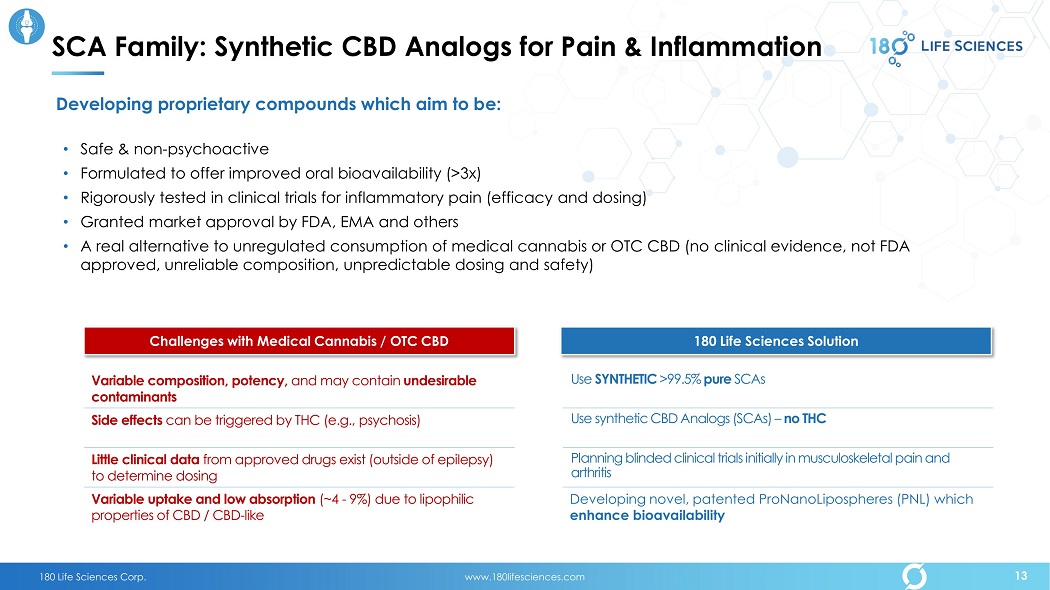 180 Life Sciences Corp. www.180lifesciences.com • Over 300,000 hip fractures each year in the US alone (1) • Strong clinical evidence for anti - TNF as preventative therapy • Patent claims granted, patent is licensed from Kennedy Trust, UK • Phase 2 multi - center trial of pre - operative anti - TNF in hip fracture surgery planned to initiate by Q3 2023; single dose administered just prior to surgery; to be completed in 2 years Post Operative Delirium/ Cognitive Deficit (POCD) Frozen Shoulder • Affects 9% of the of the population aged 25 - 64yr, more common in diabetics (2) • Only treatment for early stage is local steroid injection for short term relief • Trial protocol completed and NIHR grant received for feasibility study. Feasibility study closed for enrollment • Phase 2 clinical trial site and country will be determined in 2023 (1) https://www.cdc.gov/homeandrecreationalsafety/falls/adulthipfx.html (2) Walker - Bone K et al (2004) Arthritis Rheum 51(4):642 - 651 12 Additional Near - Term Anti - TNF Indications