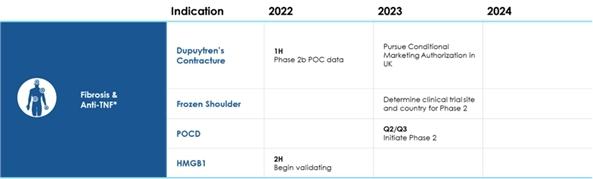 On January 13, 2023, the Company entered into an agreement with Kinexum, which agreed to provide assistance to the Company in connection with the Conditional Marketing Authorization (CMA) and Marketing Approval Application (MAA) which the Company expects to submit to the UK Medicines and Healthcare products Regulatory Agency (MHRA) in connection with the Company’s planned use of adalimumab to treat progressive early-stage Dupuytren’s disease. Including the costs associated with the Kinexum contract, the Company anticipates that it will spend approximately $900,000 to $1,000,000, cumulative in the three quarters ending September 30, 2023 for activities associated with the MHRA filing and other regulatory preparation.