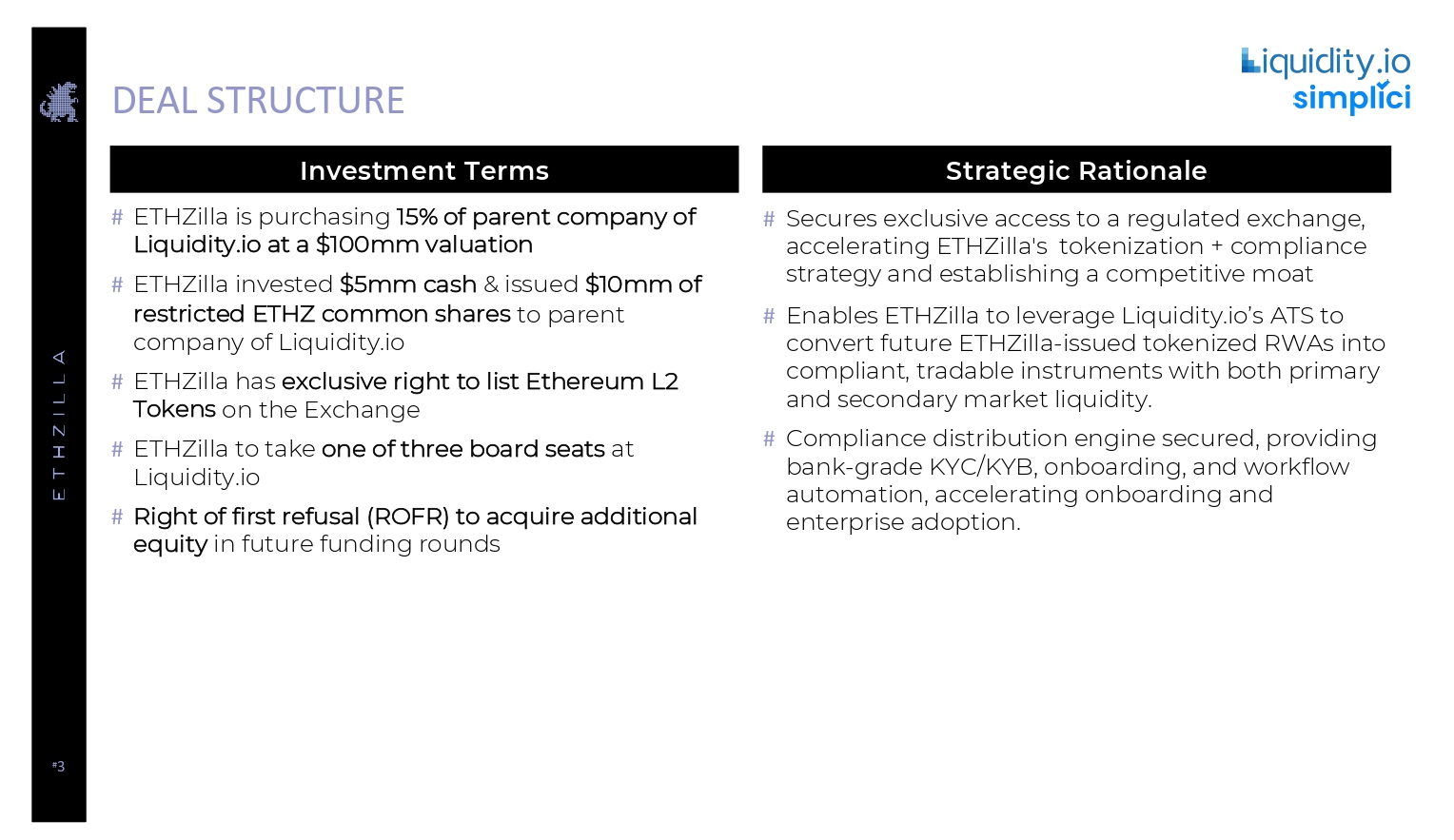 # 3 DEAL STRUCTURE # ETHZilla is purchasing 15% of parent company of Liquidity.io at a $100mm valuation # ETHZilla invested $5mm cash & issued $10mm of restricted ETHZ common shares to parent company of Liquidity.io # ETHZilla has exclusive right to list Ethereum L2 Tokens on the Exchange # ETHZilla to take one of three board seats at Liquidity.io # Right of first refusal (ROFR) to acquire additional equity in future funding rounds Investment Terms Strategic Rationale # Secures exclusive access to a regulated exchange, accelerating ETHZilla's tokenization + compliance strategy and establishing a competitive moat # Enables ETHZilla to leverage Liquidity.io’s ATS to convert future ETHZilla - issued tokenized RWAs into compliant, tradable instruments with both primary and secondary market liquidity. # Compliance distribution engine secured, providing bank - grade KYC/KYB, onboarding, and workflow automation, accelerating onboarding and enterprise adoption.