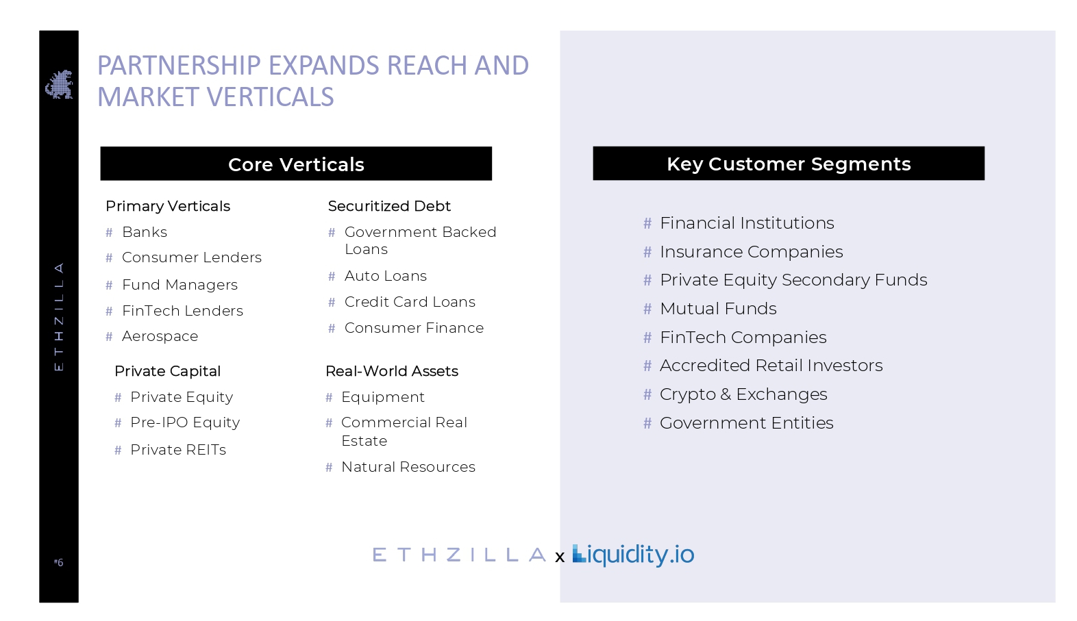 # 6 PARTNERSHIP EXPANDS REACH AND MARKET VERTICALS Primary Verticals # Banks # Consumer Lenders # Fund Managers # FinTech Lenders # Aerospace # Financial Institutions # Insurance Companies # Private Equity Secondary Funds # Mutual Funds # FinTech Companies # Accredited Retail Investors # Crypto & Exchanges # Government Entities Real - World Assets # Equipment # Commercial Real Estate # Natural Resources Securitized Debt # Government Backed Loans # Auto Loans # Credit Card Loans # Consumer Finance Private Capital # Private Equity # Pre - IPO Equity # Private REITs Core Verticals Key Customer Segments X
