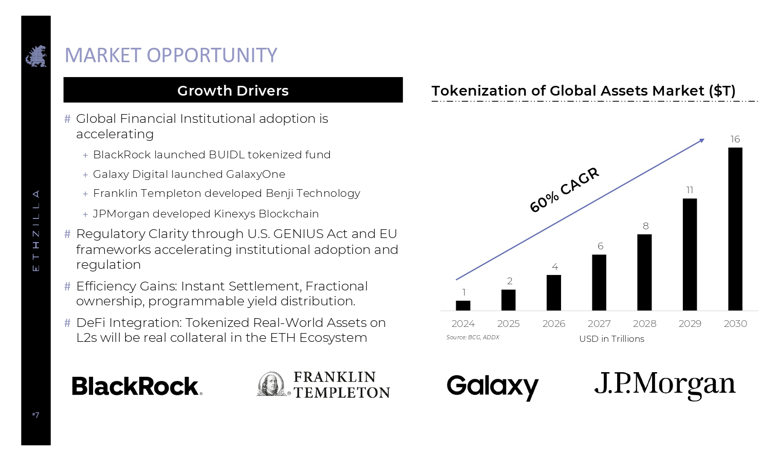 # 7 MARKET OPPORTUNITY 1 2 4 6 8 11 16 2024 2025 2026 2027 2028 2029 2030 # Global Financial Institutional adoption is accelerating + BlackRock launched BUIDL tokenized fund + Galaxy Digital launched GalaxyOne + Franklin Templeton developed Benji Technology + JPMorgan developed Kinexys Blockchain # Regulatory Clarity through U.S. GENIUS Act and EU frameworks accelerating institutional adoption and regulation # Efficiency Gains: Instant Settlement, Fractional ownership, programmable yield distribution. # DeFi Integration: Tokenized Real - World Assets on L2s will be real collateral in the ETH Ecosystem Growth Drivers USD in Trillions Source: BCG, ADDX Tokenization of Global Assets Market ($T)