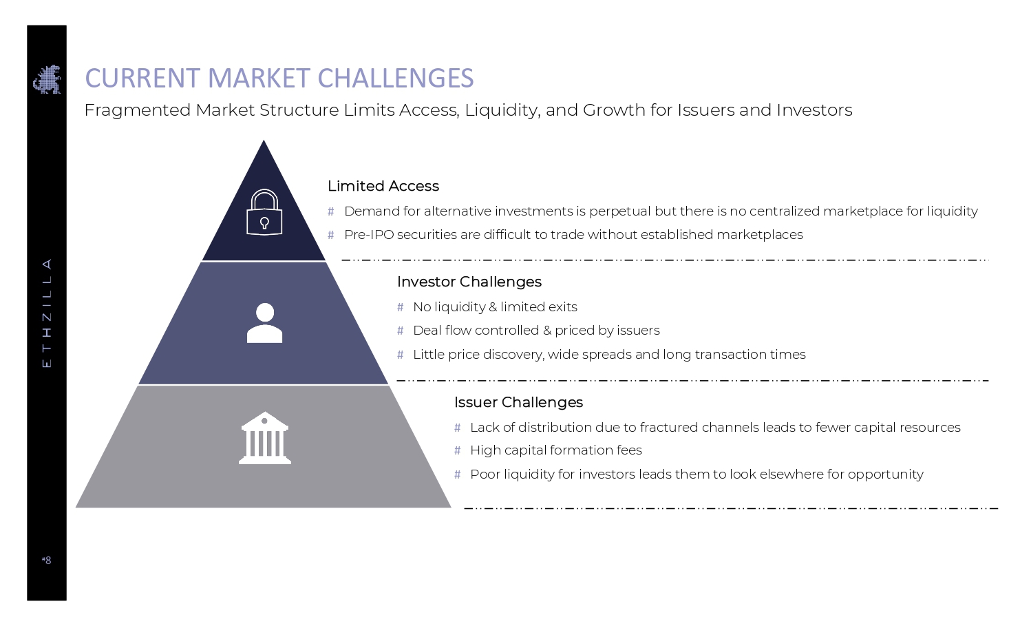 # 8 CURRENT MARKET CHALLENGES Limited Access # Demand for alternative investments is perpetual but there is no centralized marketplace for liquidity # Pre - IPO securities are difficult to trade without established marketplaces Investor Challenges # No liquidity & limited exits # Deal flow controlled & priced by issuers # Little price discovery, wide spreads and long transaction times Issuer Challenges # Lack of distribution due to fractured channels leads to fewer capital resources # High capital formation fees # Poor liquidity for investors leads them to look elsewhere for opportunity Fragmented Market Structure Limits Access, Liquidity, and Growth for Issuers and Investors