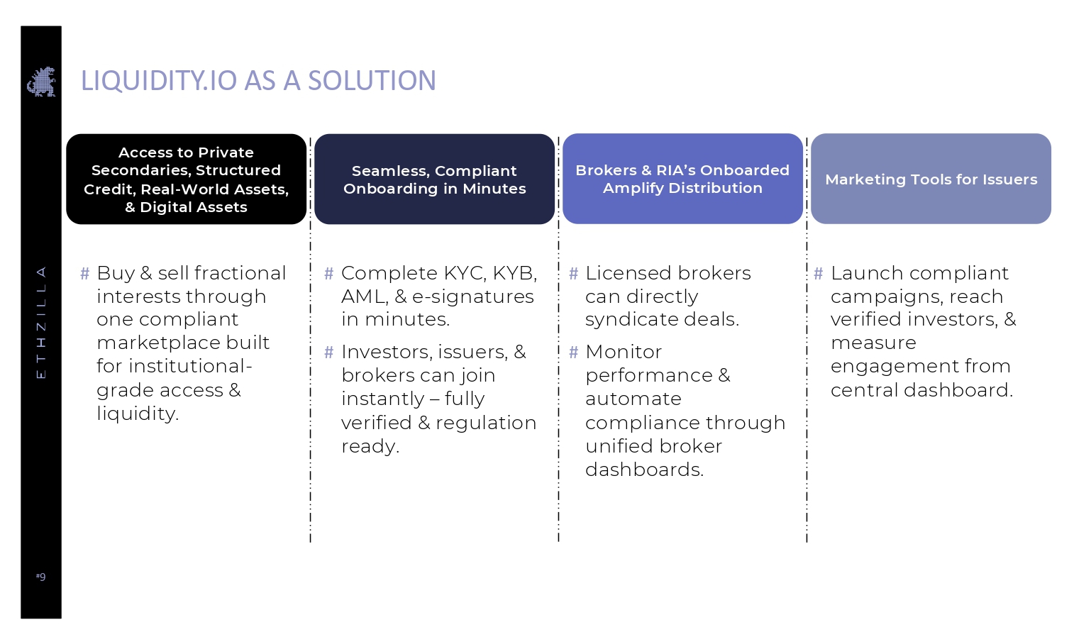 # 9 LIQUIDITY.IO AS A SOLUTION # Buy & sell fractional interests through one compliant marketplace built for institutional - grade access & liquidity. # Complete KYC, KYB, AML, & e - signatures in minutes. # Investors, issuers, & brokers can join instantly – fully verified & regulation ready. # Licensed brokers can directly syndicate deals. # Monitor performance & automate compliance through unified broker dashboards. # Launch compliant campaigns, reach verified investors, & measure engagement from central dashboard. Access to Private Secondaries, Structured Credit, Real - World Assets, & Digital Assets Marketing Tools for Issuers Brokers & RIA’s Onboarded Amplify Distribution Seamless, Compliant Onboarding in Minutes