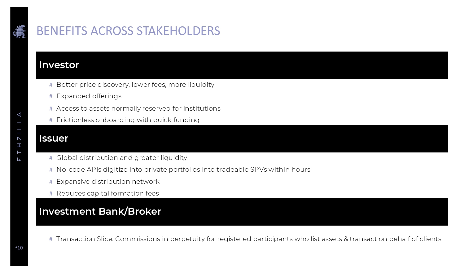 # 10 BENEFITS ACROSS STAKEHOLDERS Investor # Better price discovery, lower fees, more liquidity # Expanded offerings # Access to assets normally reserved for institutions # Frictionless onboarding with quick funding Issuer # Global distribution and greater liquidity # No - code APIs digitize into private portfolios into tradeable SPVs within hours # Expansive distribution network # Reduces capital formation fees Investment Bank/Broker # Transaction Slice: Commissions in perpetuity for registered participants who list assets & transact on behalf of clients