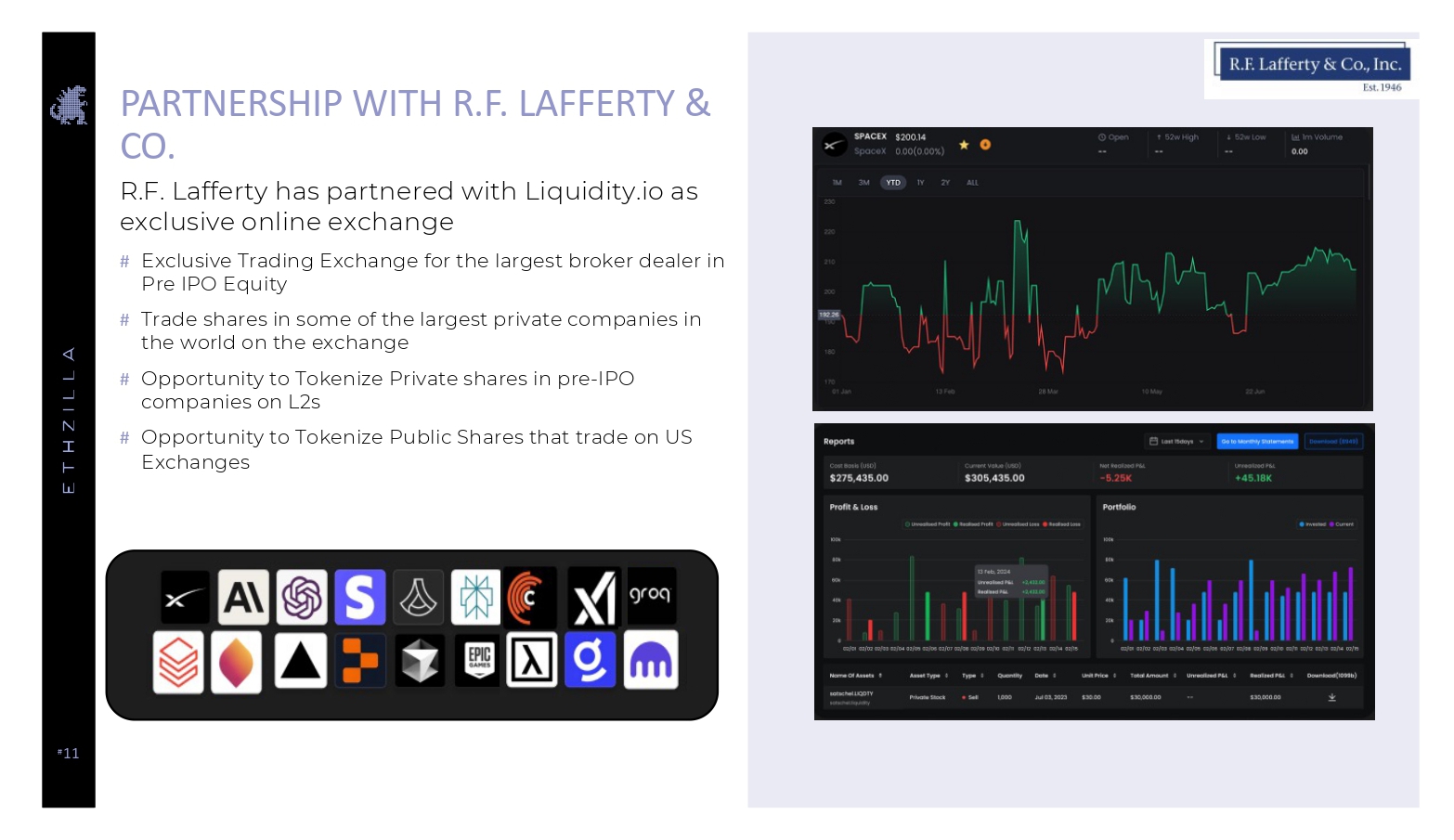 # 11 PARTNERSHIP WITH R.F. LAFFERTY & CO. R.F. Lafferty has partnered with Liquidity.io as exclusive online exchange # Exclusive Trading Exchange for the largest broker dealer in Pre IPO Equity # Trade shares in some of the largest private companies in the world on the exchange # Opportunity to Tokenize Private shares in pre - IPO companies on L2s # Opportunity to Tokenize Public Shares that trade on US Exchanges