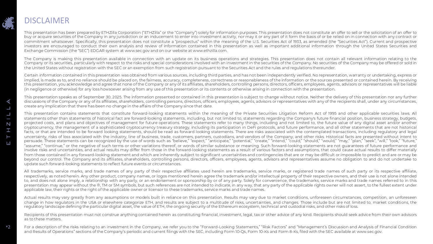 # 2 DISCLAIMER This presentation has been prepared by ETHZilla Corporation (“ETHZilla” or the “Company”) solely for information purposes . This presentation does not constitute an offer to sell or the solicitation of an offer to buy or acquire securities of the Company in any jurisdiction or an inducement to enter into investment activity, nor may it or any part of it form the basis of or be relied on in connection with any contract or commitment whatsoever . Specifically, this presentation does not constitute a “prospectus” within the meaning of the U . S . Securities Act of 1933 , as amended (the “Securities Act”) . Current and prospective investors are encouraged to conduct their own analysis and review of information contained in this presentation as well as important additional information through the United States Securities and Exchange Commission (the “SEC”) EDGAR system at www . sec . gov and on our website at www . ethzilla . com . The Company is making this presentation available in connection with an update on its business operations and strategies . This presentation does not contain all relevant information relating to the Company or its securities, particularly with respect to the risks and special considerations involved with an investment in the securities of the Company . No securities of the Company may be offered or sold in the United States without registration with the SEC or an exemption from such registration pursuant to the Securities Act and the rules and regulations thereunder . Certain information contained in this presentation was obtained from various sources, including third parties, and has not been independently verified . No representation, warranty or undertaking, express or implied, is made as to, and no reliance should be placed on, the fairness, accuracy, completeness, correctness or reasonableness of the information or the sources presented or contained herein . By receiving this presentation, you acknowledge and agree that none of the Company or any of its affiliates, shareholders, controlling persons, directors, officers, employees, agents, advisors or representatives will be liable (in negligence or otherwise) for any loss howsoever arising from any use of this presentation or its contents or otherwise arising in connection with the presentation . This presentation speaks as of September 30 , 2025 . The information presented or contained in this presentation is subject to change without notice . Neither the delivery of this presentation nor any further discussions of the Company or any of its affiliates, shareholders, controlling persons, directors, officers, employees, agents, advisors or representatives with any of the recipients shall, under any circumstances, create any implication that there has been no change in the affairs of the Company since that date . This presentation contains statements that constitute forward - looking statements within the meaning of the Private Securities Litigation Reform Act of 1995 and other applicable securities laws . All statements other than statements of historical fact are forward - looking statements, including, but not limited to, statements regarding the Company's future financial position, business strategy, budgets, projected costs, and plans and objectives of management for future operations . These statements refer to many things, including and not limited to, the future value of any digital asset and/or another cryptocurrency, the management of a sophisticated cryptocurrency treasury strategy, including its participation in DeFi protocols, and future performance, and all other statements that are not historical facts, or that are intended to be forward looking statements, should be read as forward looking statements . There are risks associated with the contemplated transactions, including regulatory and legal uncertainty, risks of loss associated with the industry, line of business, trade, customers, partners, custodians, and vendors of the Company, and other risks . Historical facts are presented without intent to persuade . These statements can be recognized by the use of words such as “believe,” “expect,” “anticipate,” “potential,” “create,” “intend,” “could,” “should,” “would,” “may,” “plan,” “seek”, “will,” “look,” “future,” “assume,” “continue,” or the negative of such terms or other variations thereof, or words of similar substance or meaning . Such forward - looking statements are not guarantees of future performance and involve risks and uncertainties, and actual results may differ from those in the forward - looking statements as a result of various factors and assumptions, that could cause actual results to differ materially from those contained in any forward - looking statement and which are inherently subject to significant uncertainties and contingencies that are or may be difficult or impossible to predict and are or may be beyond our control . The Company and its affiliates, shareholders, controlling persons, directors, officers, employees, agents, advisors and representatives assume no obligation to and do not undertake to update such forward - looking statements to reflect future events or circumstances . All trademarks, service marks, and trade names of any party of their respective affiliates used herein are trademarks, service marks, or registered trade names of such party or its respective affiliate, respectively, as noted herein . Any other product, company names, or logos mentioned herein agree the trademark and/or intellectual property of their respective owners, and their use is not alone intended to, and does not alone imply, a relationship with any party, or an endorsement or sponsorship by or of any party . Solely for convenience, the trademarks, service marks and trade names referred to in this presentation may appear without the ®, TM or SM symbols, but such references are not 