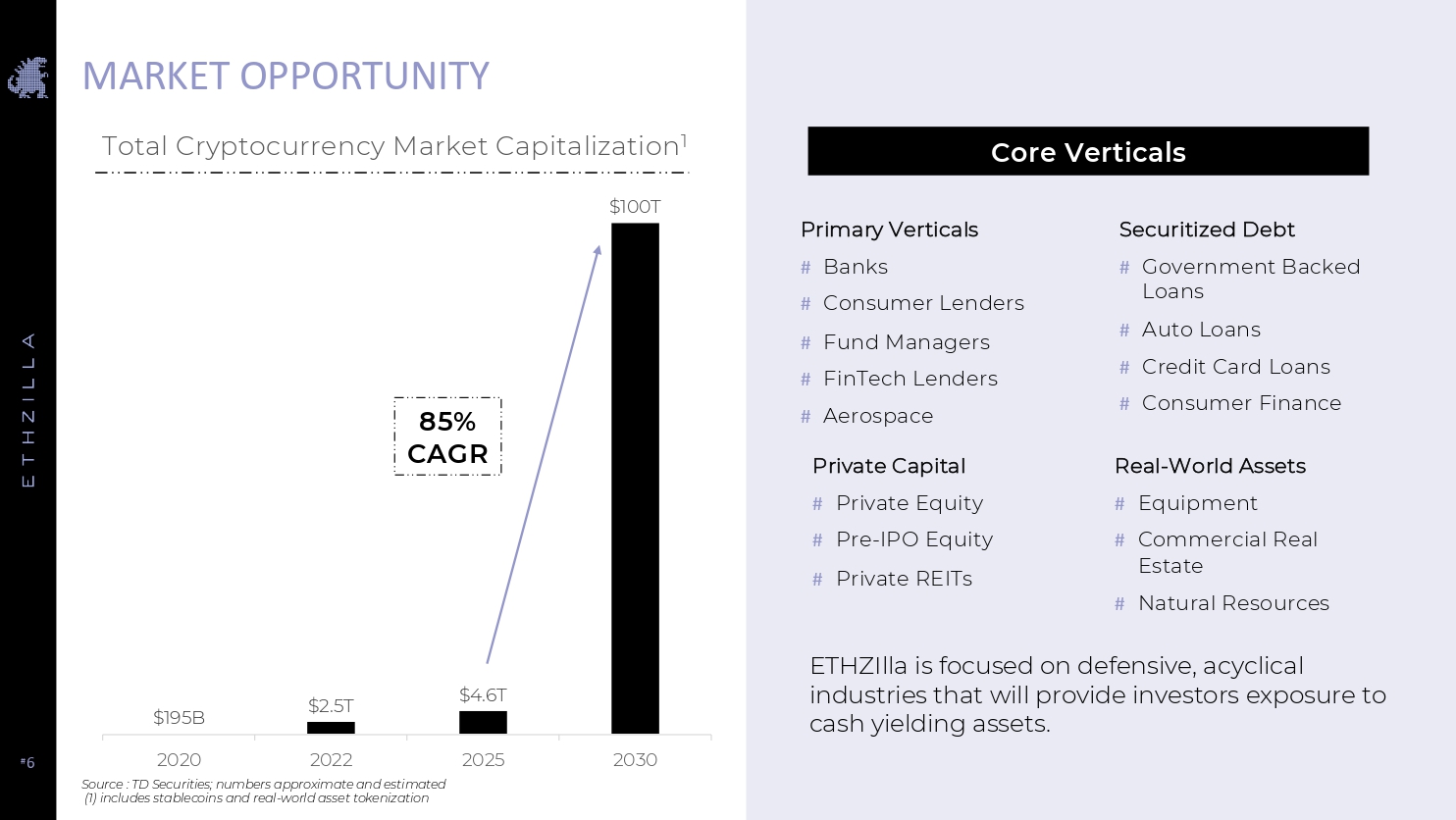 # 6 Core Verticals ETHZIlla is focused on defensive, acyclical industries that will provide investors exposure to cash yielding assets. MARKET OPPORTUNITY $195B $2.5T $4.6T $100T 2020 2022 2025 2030 85% CAGR Primary Verticals # Banks # Consumer Lenders # Fund Managers # FinTech Lenders # Aerospace Real - World Assets # Equipment # Commercial Real Estate # Natural Resources Securitized Debt # Government Backed Loans # Auto Loans # Credit Card Loans # Consumer Finance Private Capital # Private Equity # Pre - IPO Equity # Private REITs Source : TD Securities; numbers approximate and estimated (1) includes stablecoins and real - world asset tokenization Total Cryptocurrency Market Capitalization 1