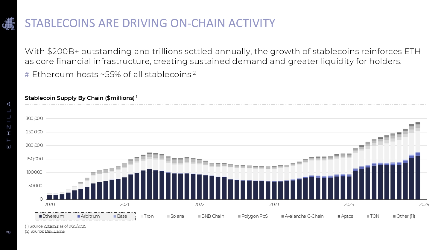 # 9 STABLECOINS ARE DRIVING ON - CHAIN ACTIVITY (1) Source: Artemis as of 9/25/2025 (2) Source: DeFiLlama With $200B+ outstanding and trillions settled annually, the growth of stablecoins reinforces ETH as core financial infrastructure, creating sustained demand and greater liquidity for holders. # Ethereum hosts ~55% of all stablecoins 2 Stablecoin Supply By Chain ($millions) 1 0 50,000 100,000 150,000 200,000 250,000 300,000 2020 2021 2022 2023 2024 2025 Millions Ethereum Arbitrum Base Tron Solana BNB Chain Polygon PoS Avalanche C-Chain Aptos TON Other (11)