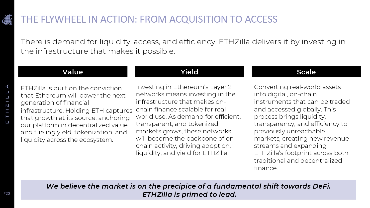 # 20 THE FLYWHEEL IN ACTION: FROM ACQUISITION TO ACCESS There is demand for liquidity, access, and efficiency. ETHZilla delivers it by investing in the infrastructure that makes it possible. ETHZilla is built on the conviction that Ethereum will power the next generation of financial infrastructure. Holding ETH captures that growth at its source, anchoring our platform in decentralized value and fueling yield, tokenization, and liquidity across the ecosystem. Investing in Ethereum’s Layer 2 networks means investing in the infrastructure that makes on - chain finance scalable for real - world use. As demand for efficient, transparent, and tokenized markets grows, these networks will become the backbone of on - chain activity, driving adoption, liquidity, and yield for ETHZilla. Converting real - world assets into digital, on - chain instruments that can be traded and accessed globally. This process brings liquidity, transparency, and efficiency to previously unreachable markets, creating new revenue streams and expanding ETHZilla’s footprint across both traditional and decentralized finance. We believe the market is on the precipice of a fundamental shift towards DeFi. ETHZilla is primed to lead. Value Scale Yield