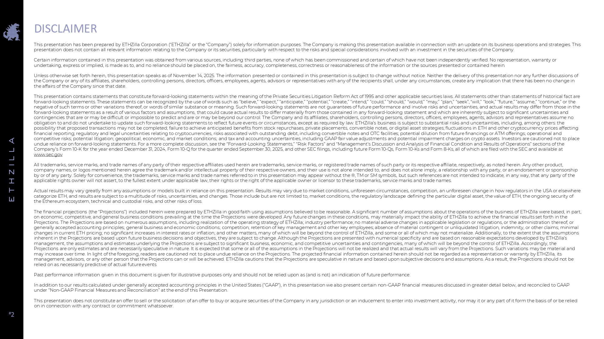 This presentation has been prepared by ETHZilla Corporation (“ETHZilla” or the “Company”) solely for information purposes. The Company is making this presentation available in connection with an update on its business operations and strategies. This presentation does not contain all relevant information relating to the Company or its securities, particularly with respect to the risks and special considerations involved with an investment in the securities of the Company. Certain information contained in this presentation was obtained from various sources, including third parties, none of which has been commissioned and certain of which have not been independently verified. No representation, warranty or undertaking, express or implied, is made as to, and no reliance should be placed on, the fairness, accuracy, completeness, correctness or reasonableness of the information or the sources presented or contained herein. Unless otherwise set forth herein, this presentation speaks as of November 14, 2025. The information presented or contained in this presentation is subject to change without notice. Neither the delivery of this presentation nor any further discussions of the Company or any of its affiliates, shareholders, controlling persons, directors, officers, employees, agents, advisors or representatives with any of the recipients shall, under any circumstances, create any implication that there has been no change in the affairs of the Company since that date. This presentation contains statements that constitute forward - looking statements within the meaning of the Private Securities Litigation Reform Act of 1995 and other applicable securities laws. All statements other than statements of historical fact are forward - looking statements. These statements can be recognized by the use of words such as “believe,” “expect,” “anticipate,” “potential,” “create,” “intend,” “could,” “should,” “would,” “may,” “plan,” “seek”, “will,” “look,” “future,” “assume,” “continue,” or the negative of such terms or other variations thereof, or words of similar substance or meaning. Such forward - looking statements are not guarantees of future performance and involve risks and uncertainties, and actual results may differ from those in the forward - looking statements as a result of various factors and assumptions, that could cause actual results to differ materially from those contained in any forward - looking statement and which are inherently subject to significant uncertainties and contingencies that are or may be difficult or impossible to predict and are or may be beyond our control. The Company and its affiliates, shareholders, controlling persons, directors, officers, employees, agents, advisors and representatives assume no obligation to and do not undertake to update such forward - looking statements to reflect future events or circumstances, except as required by law. ETHZilla’s business is subject to substantial risks and uncertainties, including, among others: the possibility that proposed transactions may not be completed; failure to achieve anticipated benefits from stock repurchases, private placements, convertible notes, or digital asset strategies; fluctuations in ETH and other cryptocurrency prices affecting financial reporting; regulatory and legal uncertainties relating to cryptocurrencies, risks associated with outstanding debt, including convertible notes and OTC facilities; potential dilution from future financings or ATM offerings; operational and competitive risks; potential litigation; geopolitical, economic, and market conditions; and tax and accounting uncertainties, including GAAP fair value adjustments and potential impairment charges on crypto assets. Investors are cautioned not to place undue reliance on forward - looking statements. For a more complete discussion, see the “Forward - Looking Statements,” “Risk Factors” and “Management’s Discussion and Analysis of Financial Condition and Results of Operations” sections of the Company’s Form 10 - K for the year ended December 31, 2024, Form 10 - Q for the quarter ended September 30, 2025, and other SEC filings, including future Form 10 - Qs, Form 10 - Ks and Form 8 - Ks, all of which are filed with the SEC and available at www.sec.gov . All trademarks, service marks, and trade names of any party of their respective affiliates used herein are trademarks, service marks, or registered trade names of such party or its respective affiliate, respectively, as noted herein. Any other product, company names, or logos mentioned herein agree the trademark and/or intellectual property of their respective owners, and their use is not alone intended to, and does not alone imply, a relationship with any party, or an endorsement or sponsorship by or of any party. Solely for convenience, the trademarks, service marks and trade names referred to in this presentation may appear without the ®, TM or SM symbols, but such references are not intended to indicate, in any way, that any party of the applicable rights owner will not assert, to the fullest extent under applicable law, their rights or the right of the applicable owner or licensor to these trademarks, service marks and trade names. Actual results may vary greatly from any assumptions or models built in reliance on this presentation. Results may vary due to market conditions, unforeseen circumstances, competition, an unforeseen change in how regulators in the USA or elsewhere categorize ETH, and results are subject to a multitude of risks, uncertainties, and changes. Those include but are not limited to, market conditions, the regulatory landscape defining the particular digital asset, the value of ETH, the ongoing security of the Ethereum ecosystem, technical and custodial risks, and other risks of loss. The financial projections (the “Projections”) included herein were prepared by ETHZil