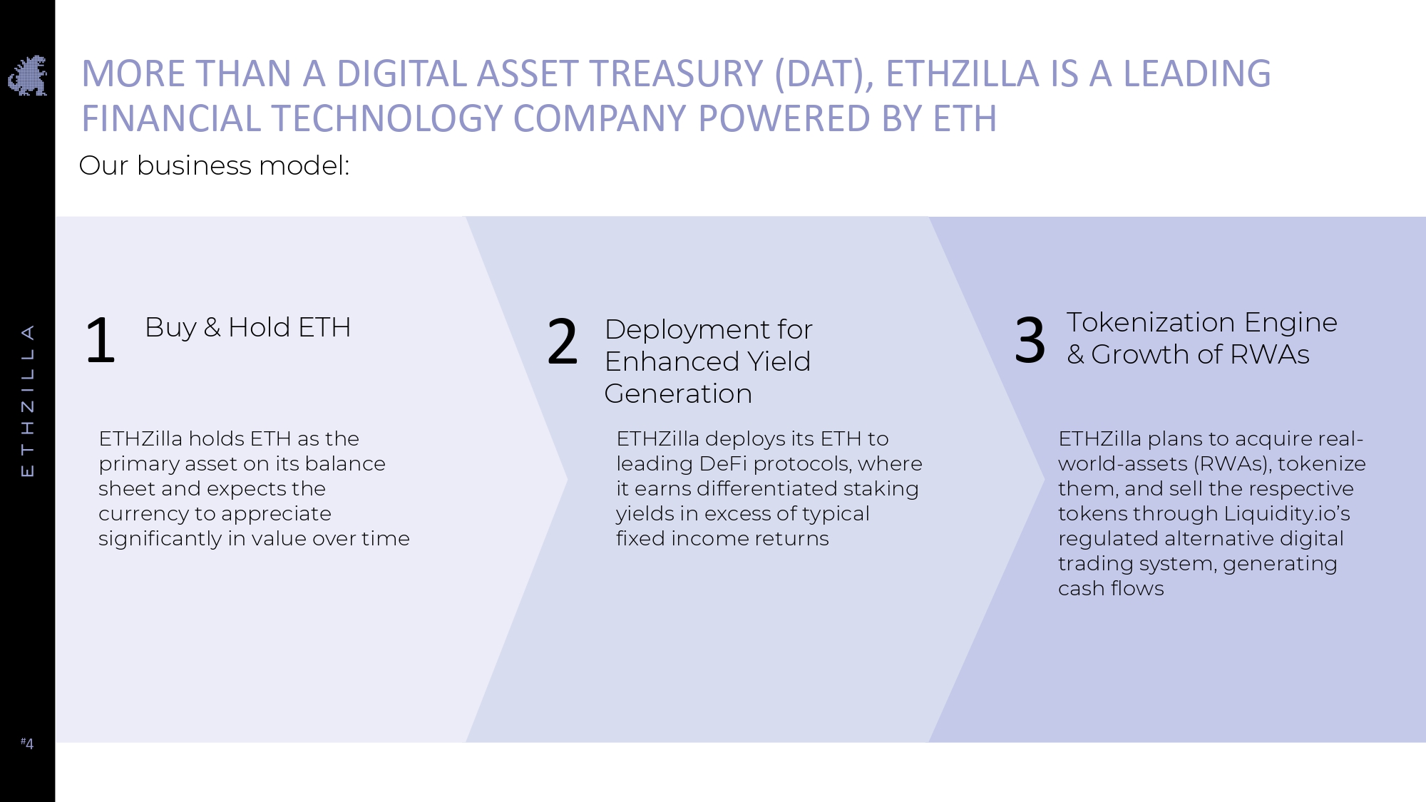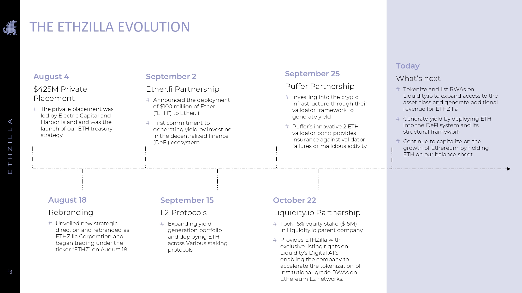 # 3 THE ETHZILLA EVOLUTION August 18 Rebranding # Unveiled new strategic direction and rebranded as ETHZilla Corporation and began trading under the ticker “ETHZ” on August 18 August 4 $425M Private Placement # The private placement was led by Electric Capital and Harbor Island and was the launch of our ETH treasury strategy September 2 Ether.fi Partnership # Announced the deployment of $100 million of Ether (“ETH”) to Ether.fi # First commitment to generating yield by investing in the decentralized finance (DeFi) ecosystem September 15 L2 Protocols # Expanding yield generation portfolio and deploying ETH across Various staking protocols September 25 Puffer Partnership # Investing into the crypto infrastructure through their validator framework to generate yield # Puffer’s innovative 2 ETH validator bond provides insurance against validator failures or malicious activity October 22 Liquidity.io Partnership # Took 15% equity stake ($15M) in Liquidity.io parent company # Provides ETHZilla with exclusive listing rights on Liquidity’s Digital ATS, enabling the company to accelerate the tokenization of institutional - grade RWAs on Ethereum L2 networks. Today What’s next # Tokenize and list RWAs on Liquidity.io to expand access to the asset class and generate additional revenue for ETHZilla # Generate yield by deploying ETH into the DeFi system and its structural framework # Continue to capitalize on the growth of Ethereum by holding ETH on our balance sheet