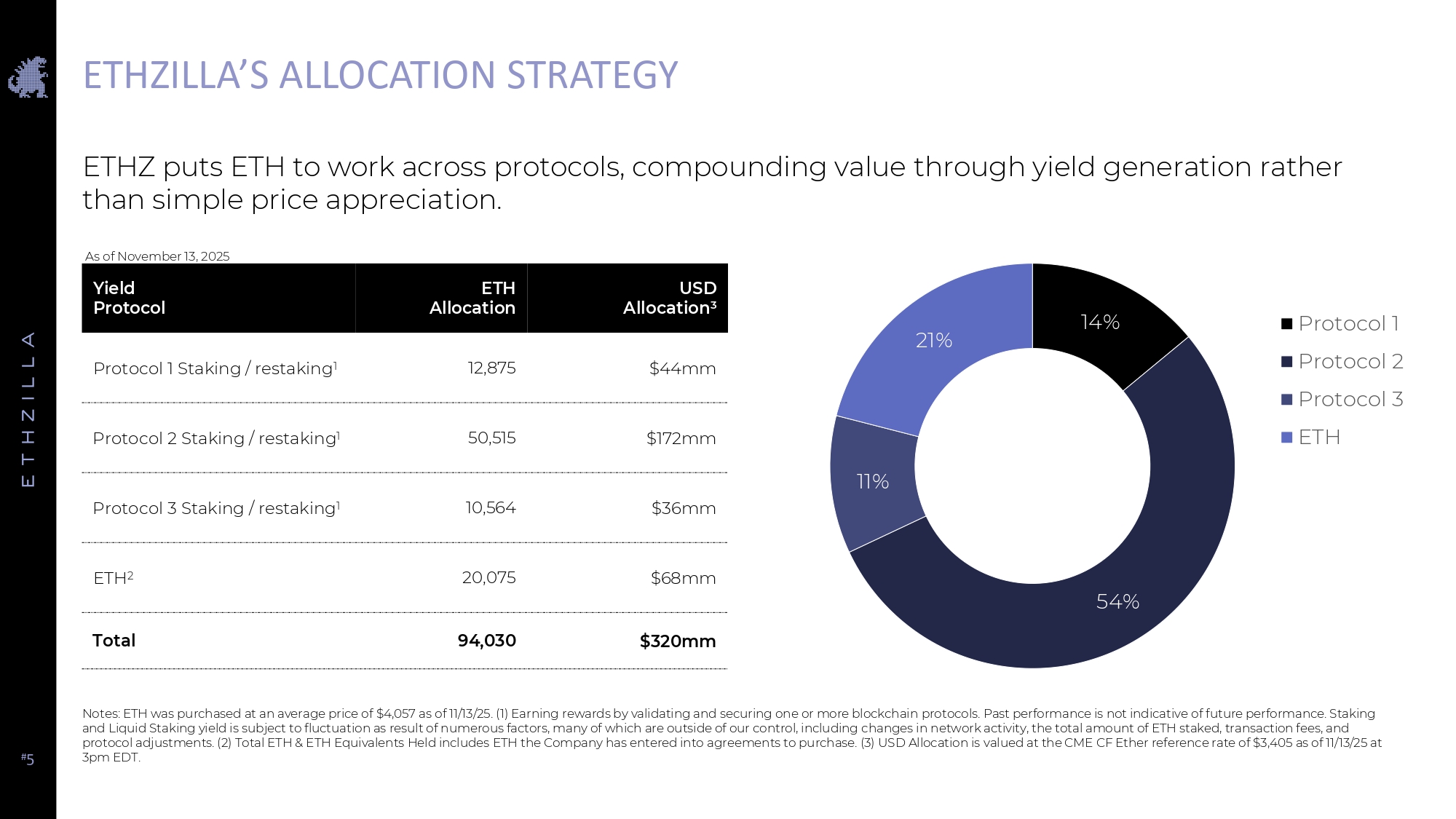 # 5 ETHZILLA’S ALLOCATION STRATEGY Notes: ETH was purchased at an average price of $4,057 as of 11/13/25. (1) Earning rewards by validating and securing one or more blockchain protocols. Past performance is not indicative of future performance. Staking and Liquid Staking yield is subject to fluctuation as result of numerous factors, many of which are outside of our control, including changes in network activity, the total amount of ETH staked, transaction fees, and protocol adjustments. (2) Total ETH & ETH Equivalents Held includes ETH the Company has entered into agreements to purchase. (3) USD Allocation is valued at the CME CF Ether reference rate of $3,405 as of 11/13/25 at 3pm EDT. ETHZ puts ETH to work across protocols, compounding value through yield generation rather than simple price appreciation. USD Allocation 3 ETH Allocation Yield Protocol $44mm 12,875 Protocol 1 Staking / restaking 1 $172mm 50,515 Protocol 2 Staking / restaking 1 $36mm 10,564 Protocol 3 Staking / restaking 1 $68mm 20,075 ETH 2 $320mm 94,030 Total 14% 54% 11% 21% Protocol 1 Protocol 2 Protocol 3 ETH As of November 13, 2025