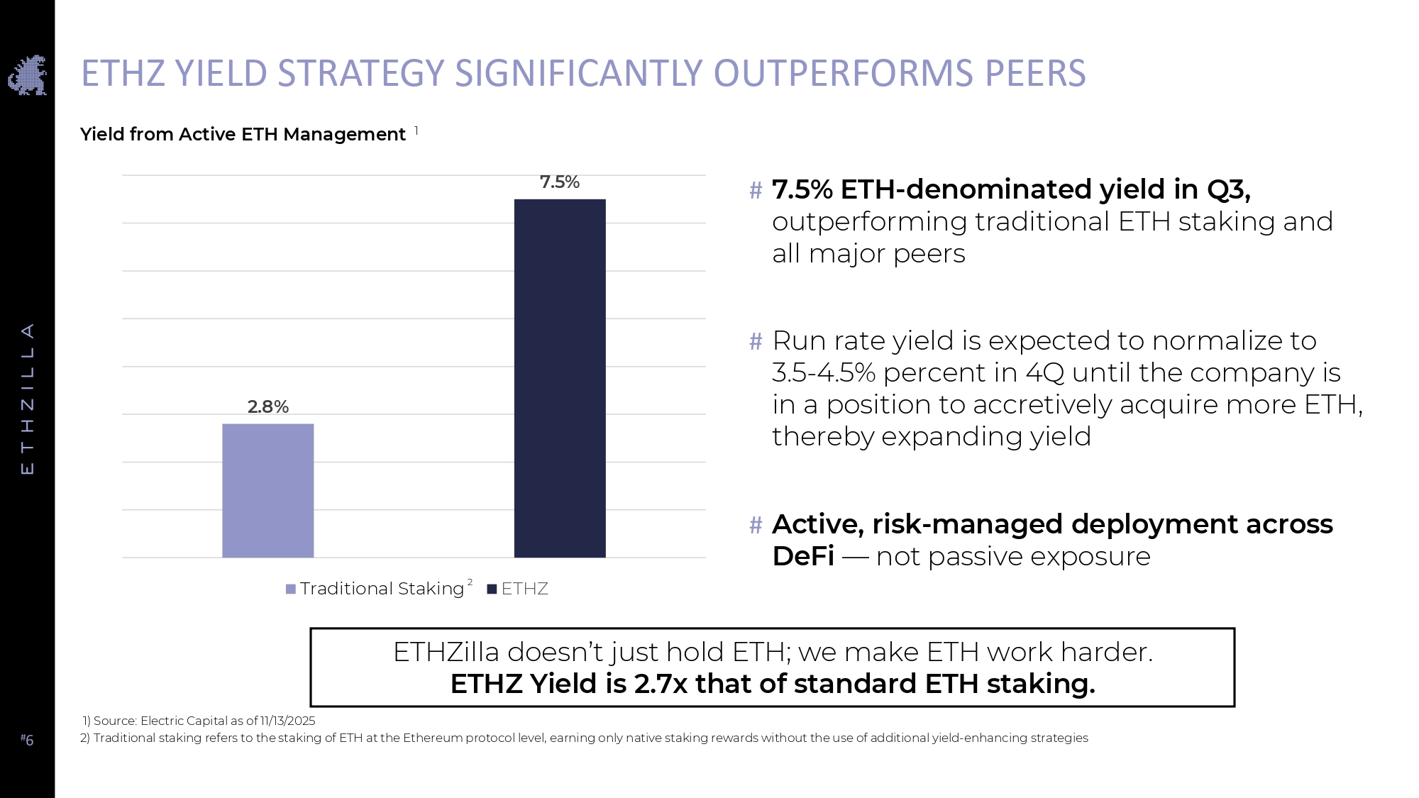 # 6 ETHZ YIELD STRATEGY SIGNIFICANTLY OUTPERFORMS PEERS 1) Source: Electric Capital as of 11/13/2025 2) Traditional staking refers to the staking of ETH at the Ethereum protocol level, earning only native staking rewards without the use of additional yield - enhancing strategies # 7.5% ETH - denominated yield in Q3, outperforming traditional ETH staking and all major peers # Run rate yield is expected to normalize to 3.5 - 4.5% percent in 4Q until the company is in a position to accretively acquire more ETH, thereby expanding yield # Active, risk - managed deployment across DeFi — not passive exposure 2.8% 7.5% Traditional Staking 2 ETHZ Yield from Active ETH Management 1 ETHZilla doesn’t just hold ETH; we make ETH work harder. ETHZ Yield is 2.7x that of standard ETH staking.