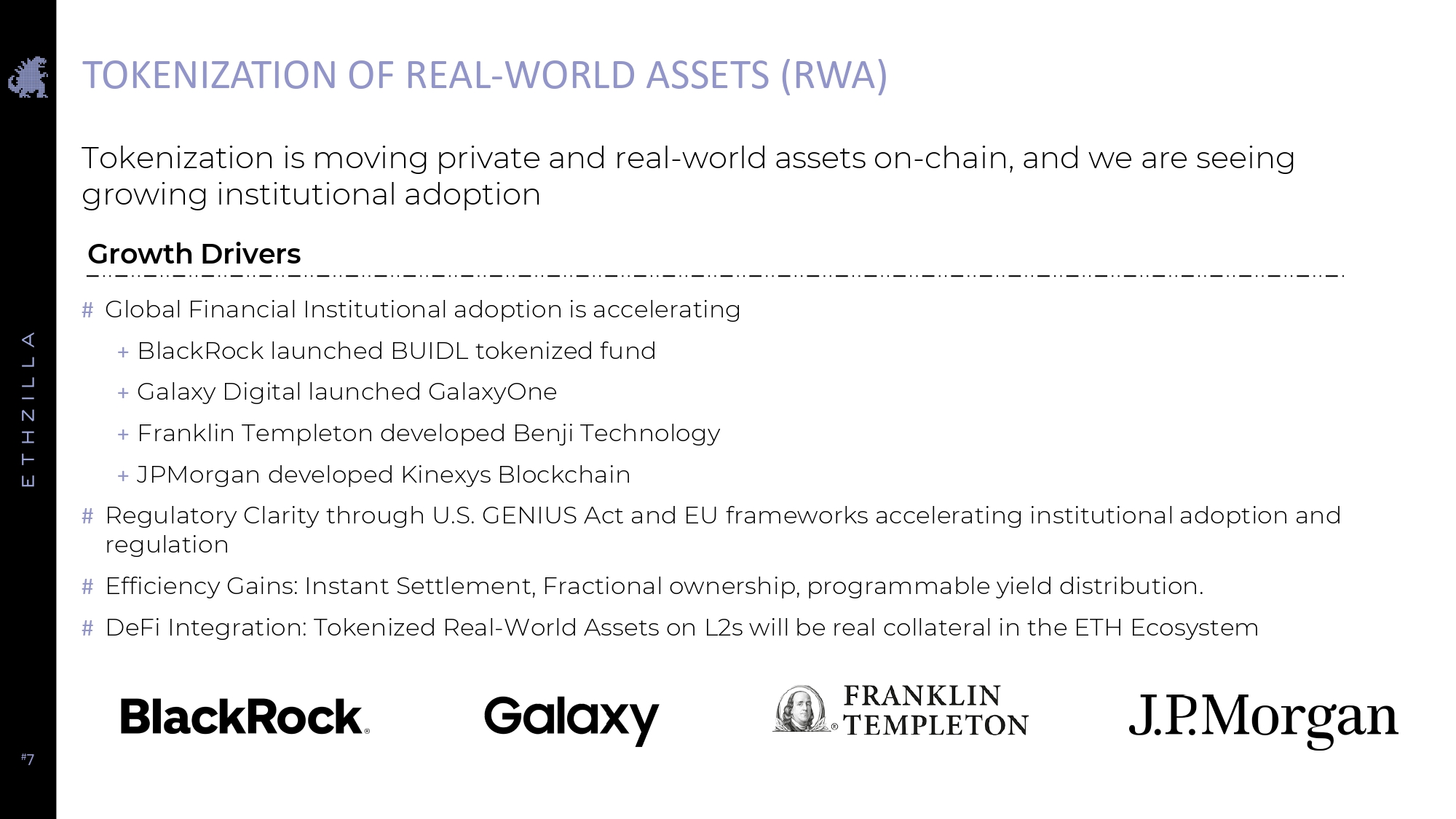 # 7 TOKENIZATION OF REAL - WORLD ASSETS (RWA) Tokenization is moving private and real - world assets on - chain, and we are seeing growing institutional adoption Growth Drivers # Global Financial Institutional adoption is accelerating + BlackRock launched BUIDL tokenized fund + Galaxy Digital launched GalaxyOne + Franklin Templeton developed Benji Technology + JPMorgan developed Kinexys Blockchain # Regulatory Clarity through U.S. GENIUS Act and EU frameworks accelerating institutional adoption and regulation # Efficiency Gains: Instant Settlement, Fractional ownership, programmable yield distribution. # DeFi Integration: Tokenized Real - World Assets on L2s will be real collateral in the ETH Ecosystem