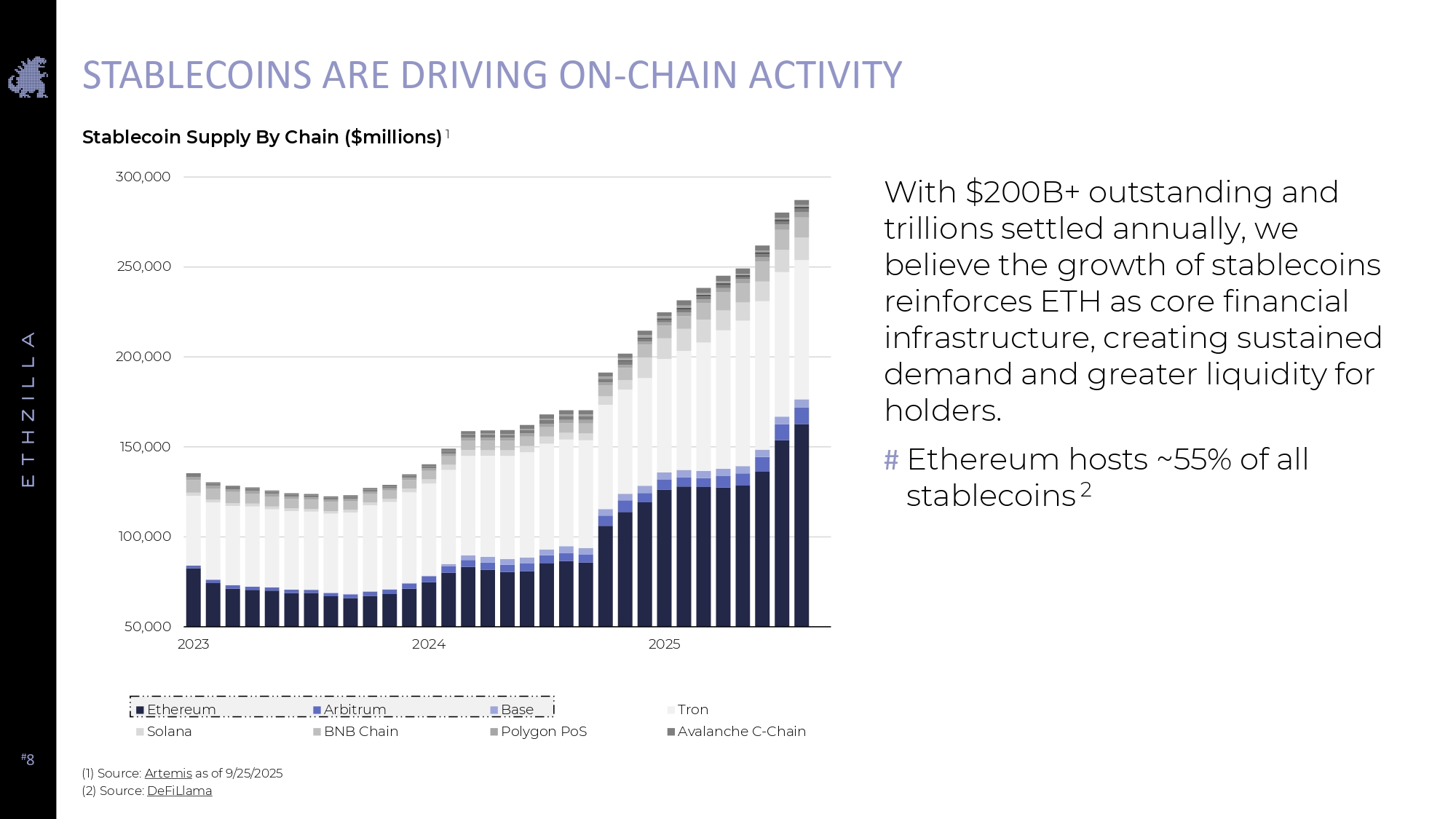 # 8 STABLECOINS ARE DRIVING ON - CHAIN ACTIVITY With $200B+ outstanding and trillions settled annually, we believe the growth of stablecoins reinforces ETH as core financial infrastructure, creating sustained demand and greater liquidity for holders. # Ethereum hosts ~55% of all stablecoins 2 Stablecoin Supply By Chain ($millions) 1 50,000 100,000 150,000 200,000 250,000 300,000 2023 2024 2025 Ethereum Arbitrum Base Tron Avalanche C - Chain Solana BNB Chain (1) Source: Artemis as of 9/25/2025 (2) Source: DeFiLlama Polygon PoS