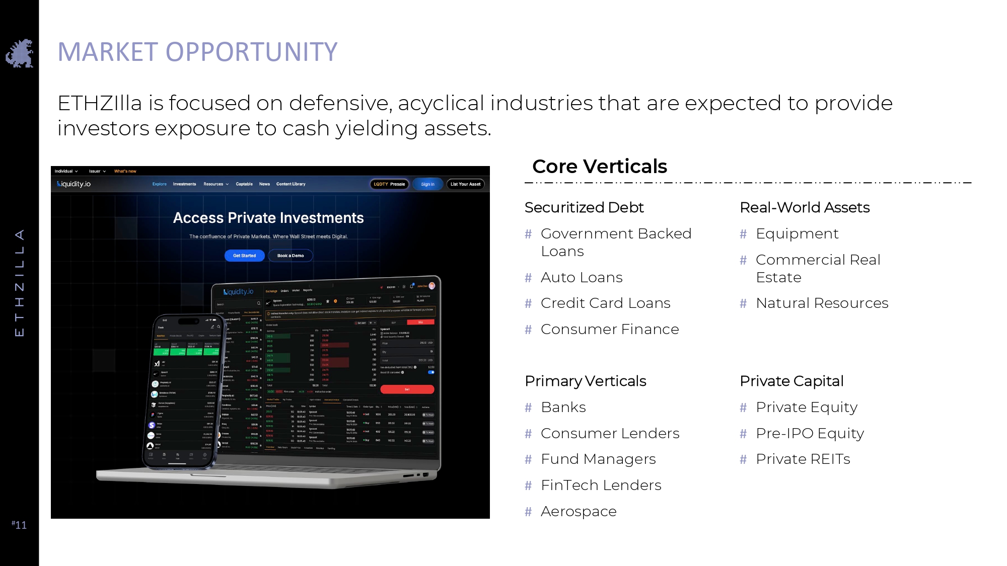 # 11 ETHZIlla is focused on defensive, acyclical industries that are expected to provide investors exposure to cash yielding assets. Core Verticals MARKET OPPORTUNITY Primary Verticals # Banks # Consumer Lenders # Fund Managers # FinTech Lenders # Aerospace Real - World Assets # Equipment # Commercial Real Estate # Natural Resources Securitized Debt # Government Backed Loans # Auto Loans # Credit Card Loans # Consumer Finance Private Capital # Private Equity # Pre - IPO Equity # Private REITs