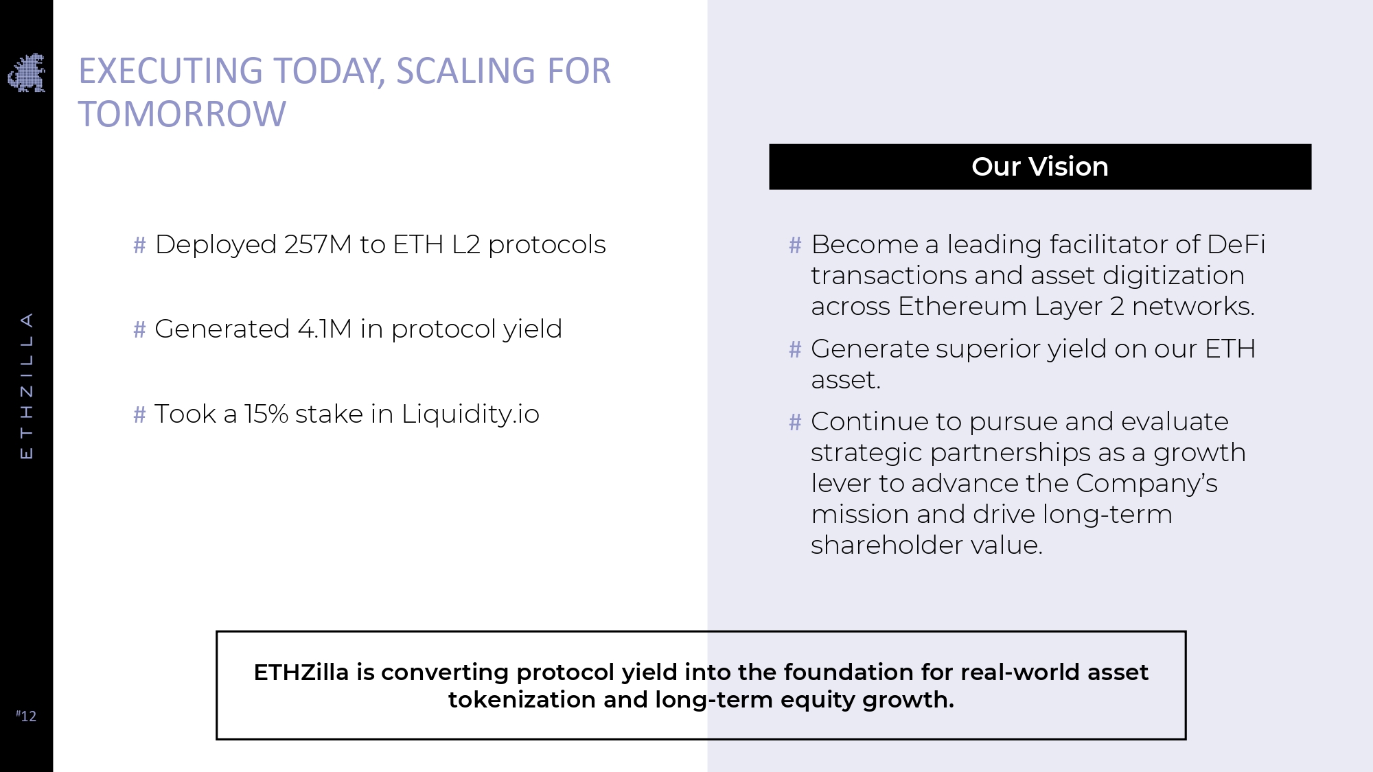 # 12 Our Vision EXECUTING TODAY, SCALING FOR TOMORROW # Deployed 257M to ETH L2 protocols # Generated 4.1M in protocol yield # Took a 15% stake in Liquidity.io # Become a leading facilitator of DeFi transactions and asset digitization across Ethereum Layer 2 networks. # Generate superior yield on our ETH asset. # Continue to pursue and evaluate strategic partnerships as a growth lever to advance the Company’s mission and drive long - term shareholder value. ETHZilla is converting protocol yield into the foundation for real - world asset tokenization and long - term equity growth.