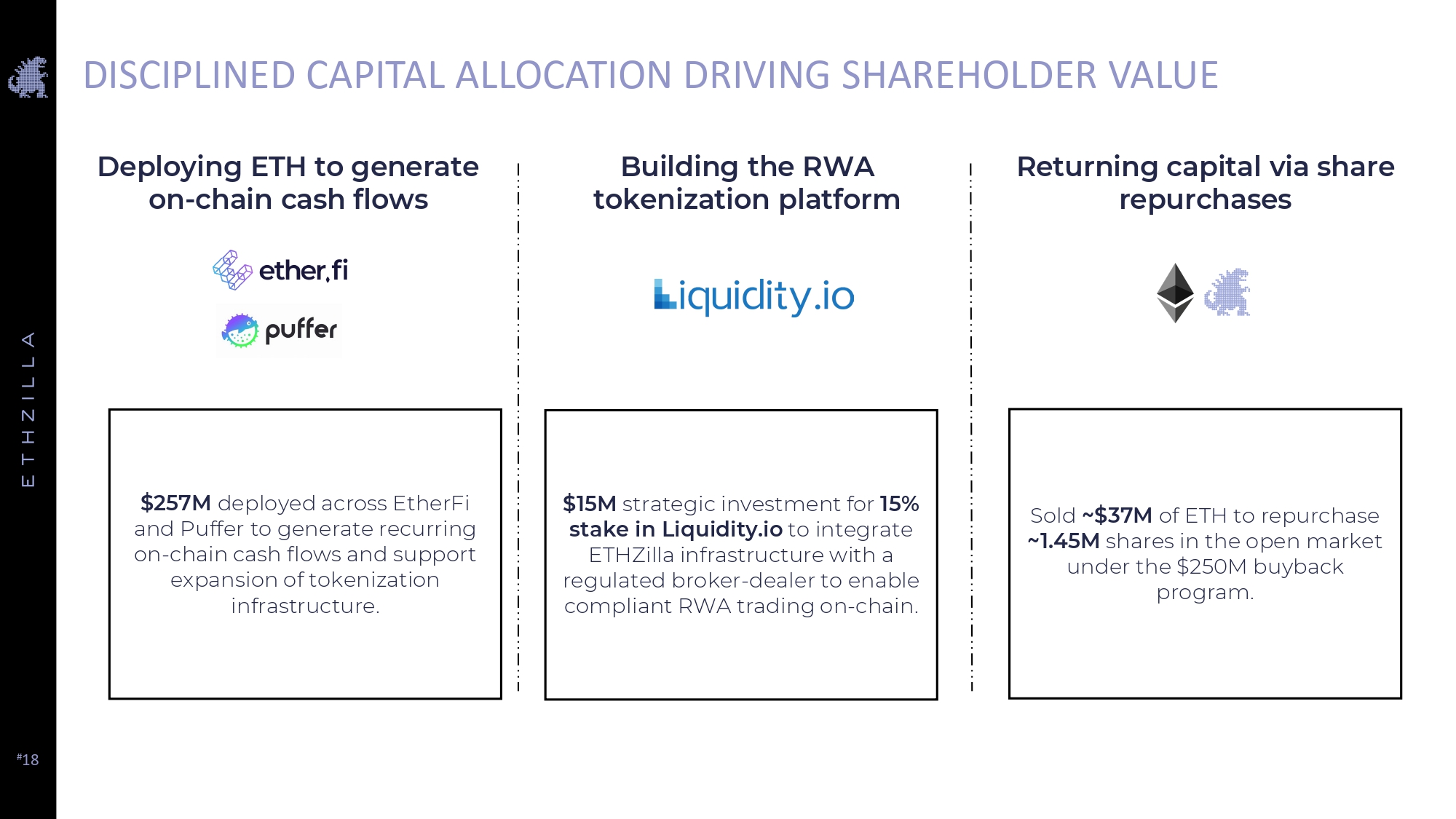 # 18 DISCIPLINED CAPITAL ALLOCATION DRIVING SHAREHOLDER VALUE Deploying ETH to generate on - chain cash flows Building the RWA tokenization platform Returning capital via share repurchases $257M deployed across EtherFi and Puffer to generate recurring on - chain cash flows and support expansion of tokenization infrastructure. $15M strategic investment for 15% stake in Liquidity.io to integrate ETHZilla infrastructure with a regulated broker - dealer to enable compliant RWA trading on - chain. Sold ~$37M of ETH to repurchase ~1.45M shares in the open market under the $250M buyback program.